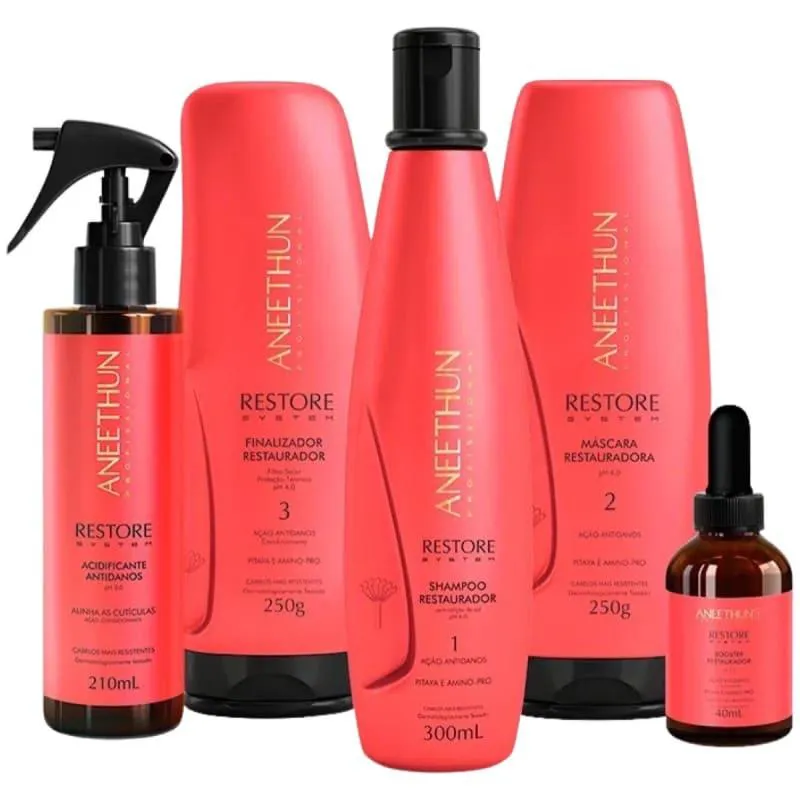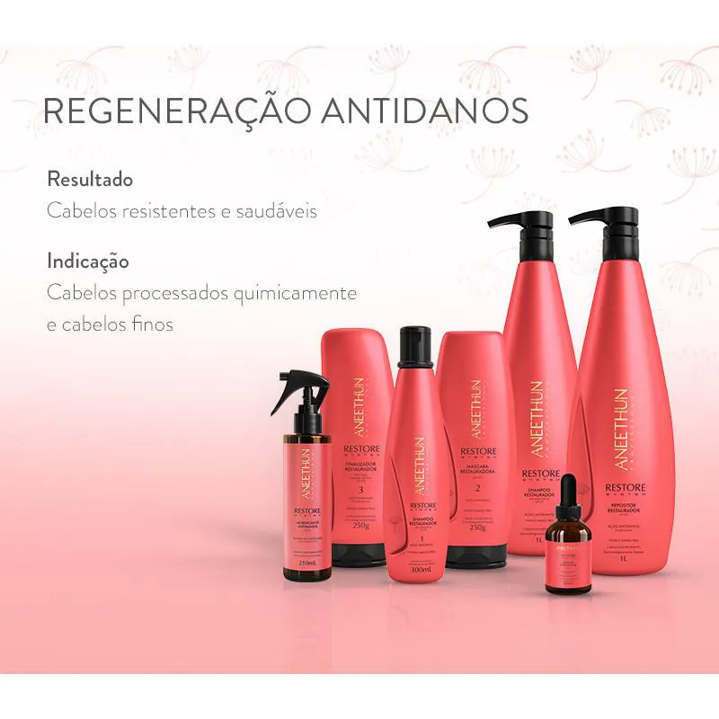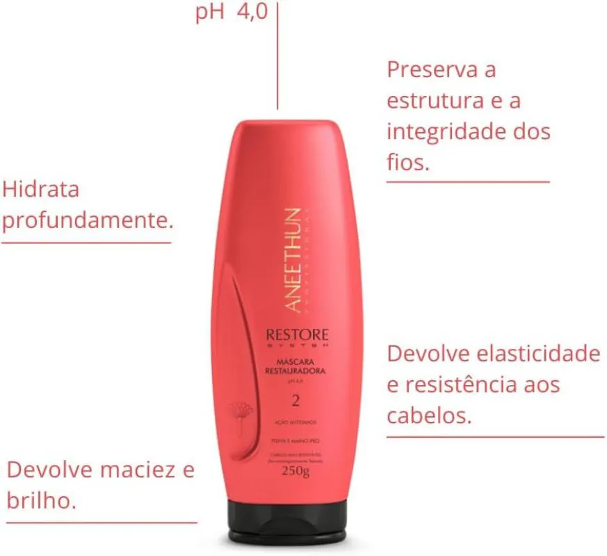 Aneethun Restore System – Máscara Restauradora 250g A Máscara Restauradora da linha Restore System da Aneethun é um tratamento intensivo indicado para cabelos danificados por processos químicos, como coloração, descoloração e alisamentos. Sua fórmula exclusiva fortalece as pontes proteicas, repõe lipídios e massa capilar, preservando a estrutura e a integridade dos fios. Benefícios: