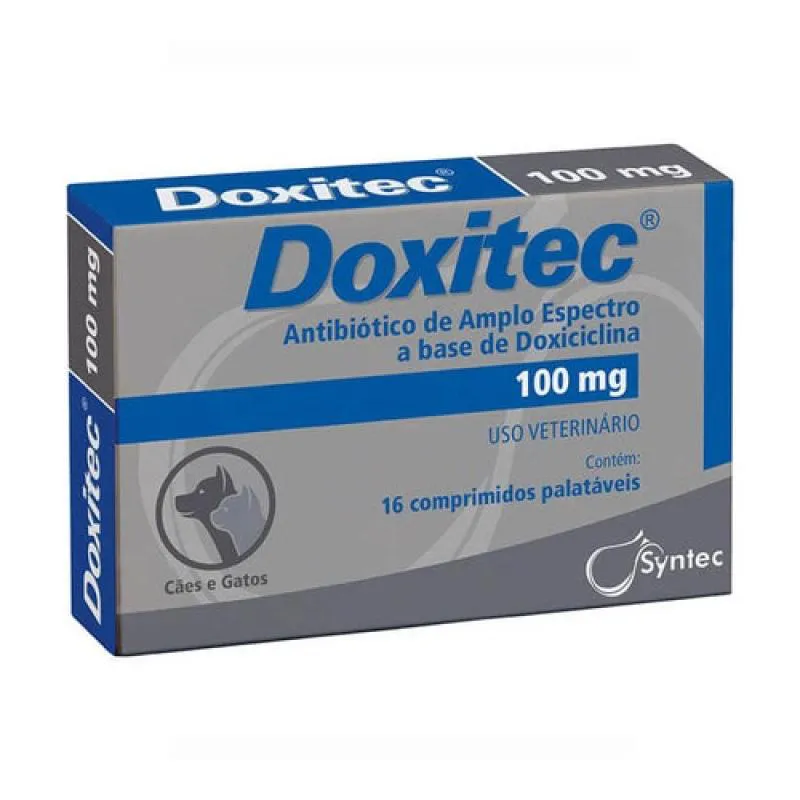 Doxitec é um antibiótico palatável oral, de amplo espectro de ação, pertencente ao grupo das tetraciclinas, agindo sobre bactérias Gram positivas, Gram negativas e organismos intracelulares. À base de Doxicicli na, é indicado para o tratamento das infecções do trato respiratório, gastrointestinal, gênito urinário, pele e anexos. Combate também a Erlichiose canina entre outras enfermidades.