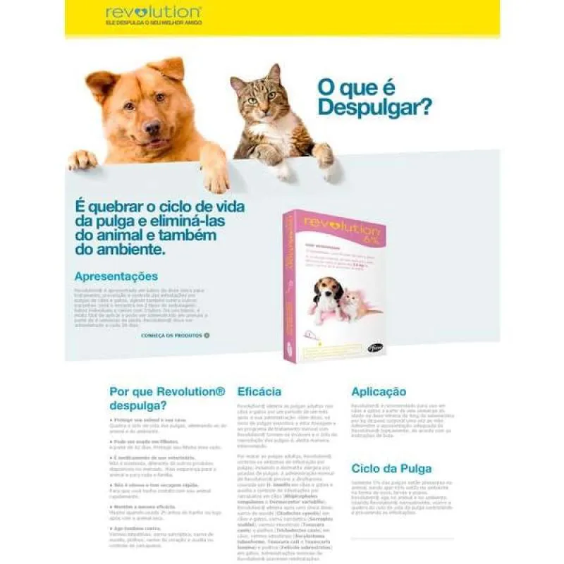 Revolution® é um antiparasitário de uso tópico, à base de Selamectina, indicado para cães e gatos a partir de 6 semanas de idade. Indicação Revolution® trata, previne e controla infestações por pulgas, controla a dermatite alérgica por picada de pulgas (DAPP), previne a dirofilariose, trata e controla sarna de ouvidos, sarna sarcóptica em cães, vermes intestinais, infestações por piolhos e é auxiliar no controle de carrapatos em cães acima de 6 semanas. Apresentação Revolution® está disponível em pipetas de uso tópico, em embalagens contendo uma ou três pipetas, nas apresentações 6% e 12% para cães (15 mg, 30 mg, 60 mg, 120 mg e 240 mg) e 6% para gatos (15 mg e 45 mg). Posologia O conteúdo de cada tubo é formulado para permitir um mínimo de 6 mg de Selamectina por kg de peso corporal