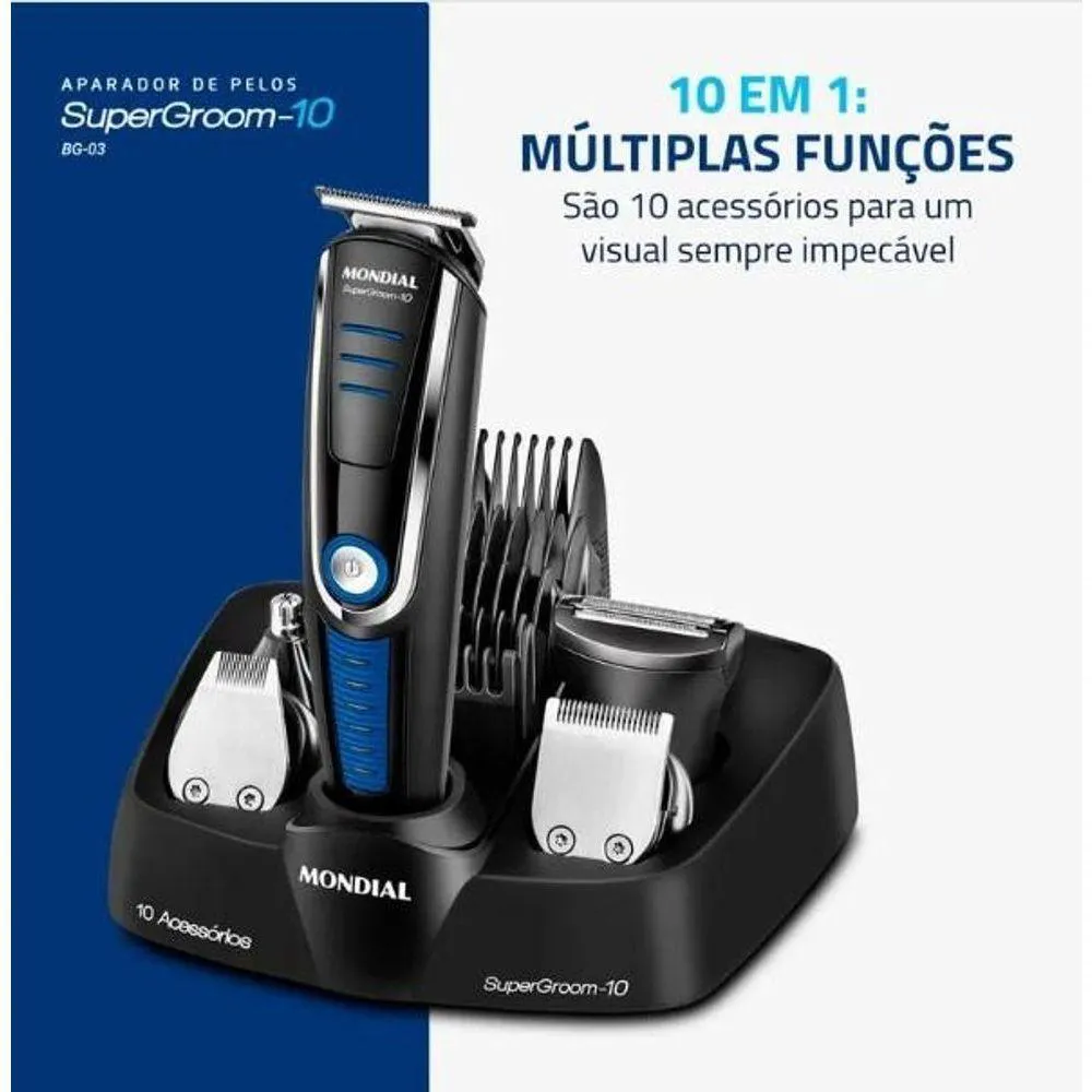 O Aparador de Pelos SuperGroom Mondial possui a funcionalidade de 10 produtos em apenas 1! Conta com 5 aparadores para cabelo, rosto e corpo, 4 pentes de corte com guias de 3, 6, 9 e 12mm, além de pente ajustável para a remoção dos pelos no comprimento que preferir. Suas lâminas em aço inox oferece alto desempenho para um corte rente, preciso e suave. Saiba mais sobre o BG-03 da Mondial: 10 EM 1 - MÚLTIPLAS FUNÇÕES: O aparador de pelos da Mondial vem com 10 acessórios: são 5 tipos de aparadores de alto desempenho e 5 pentes de corte com diferentes opções de altura para aparar e remover os pelos do rosto e do corpo inteiro. Você pode ter uma aparência impecável sem sair de casa! PENTES DE CORTE + PENTE AJUSTÁVEL: Acompanha 4 pentes de corte com 3mm, 6mm, 9mm e 12mm, além de pente ajustável com 16 níveis de altura, para aparar os pelos no comprimento que preferir. APARADOR DE CABELO: Ideal para aparar os pelos do rosto, pescoço e corpo com total praticidade. Garante o corte rente à pele quando usado sem pente de corte. APARADOR DE barba E BIGODE + PRECISÃO: Os aparadores são perfeitos para aparar com precisão a barba e áreas menores, como pequenas linhas e detalhes. APARADOR PARA NARIZ E ORELHA: Remove os pelos do nariz e orelhas com total conforto e praticidade. MICROBARBEADOR: Sistema exclusivo para aparar e raspar com suavidade os pelos rente à pele. LÂMINAS EM AÇO INOX: As lâminas em aço inox asseguram um corte rente, preciso e suave. Além disso, garantem maior durabilidade ao produto. MAIS TEMPO DE USO: A bateria recarregável de Ion Lithium garante até 90 minutos de uso sem fio. Além disso, o produto é bivolt, perfeito para usar em qualquer lugar! base CARREGADORA: Perfeita para armazenar e recarregar o aparador diretamente na base. LUZ INDICADORA: Indica o nível da bateria para carregamento.Modelo BG-03 Cor Preto/Azul Voltagem (Tensão) Bivolt Itens inclusos 01 Aparador de Pelos - 04 Cabeças aparadoras - 04 Pentes de corte - 01 Pente ajustável - 01 Base carregadora - 01 Óleo lubrificante - 01 Carregador - Manual de InstruçõesLâmina Lâmina de aço inox Recarregável Sim alimentação Energia ElétricaTipo de tomada 10A Funções Aparador, microbarbeador e cortador Uso seco ou molhado Uso apenas seco Uso sem fio Sim Indicador de bateria Sim NA | Cor: PRETO/AZUL | Voltagem: BIVOLT