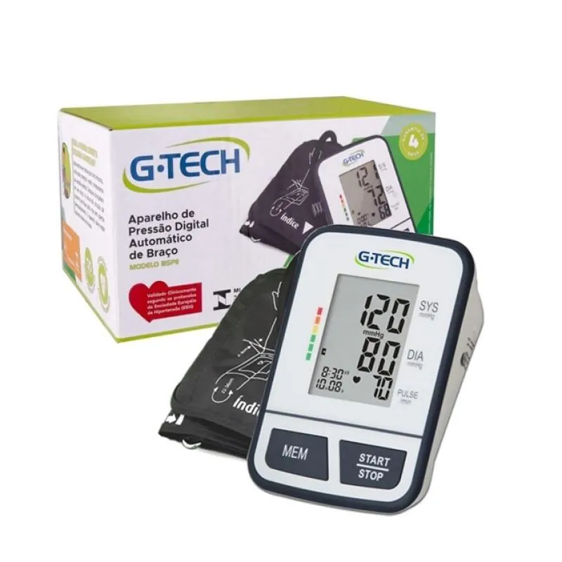 O novo Aparelho de Pressão Digital Automático de Braço G-TECH Home BSP11 é uma solução completa para medição da pressão arterial. Além das medições tradicionais de pressão arterial e frequência cardíaca, possui uma série de outros benefícios, como: Memória para 120 resultados, indicador de arritmia cardíaca, indicador gráfico de nível de hipertensão e o cálculo da média automática das três últimas medições. Todas essas funções permitem um acompanhamento completo dos níveis de pressão arterial, sempre contando com a qualidade e segurança da marca G-TECH, que oferece uma garantia de 5 anos, assegurando tranquilidade por um período estendido.