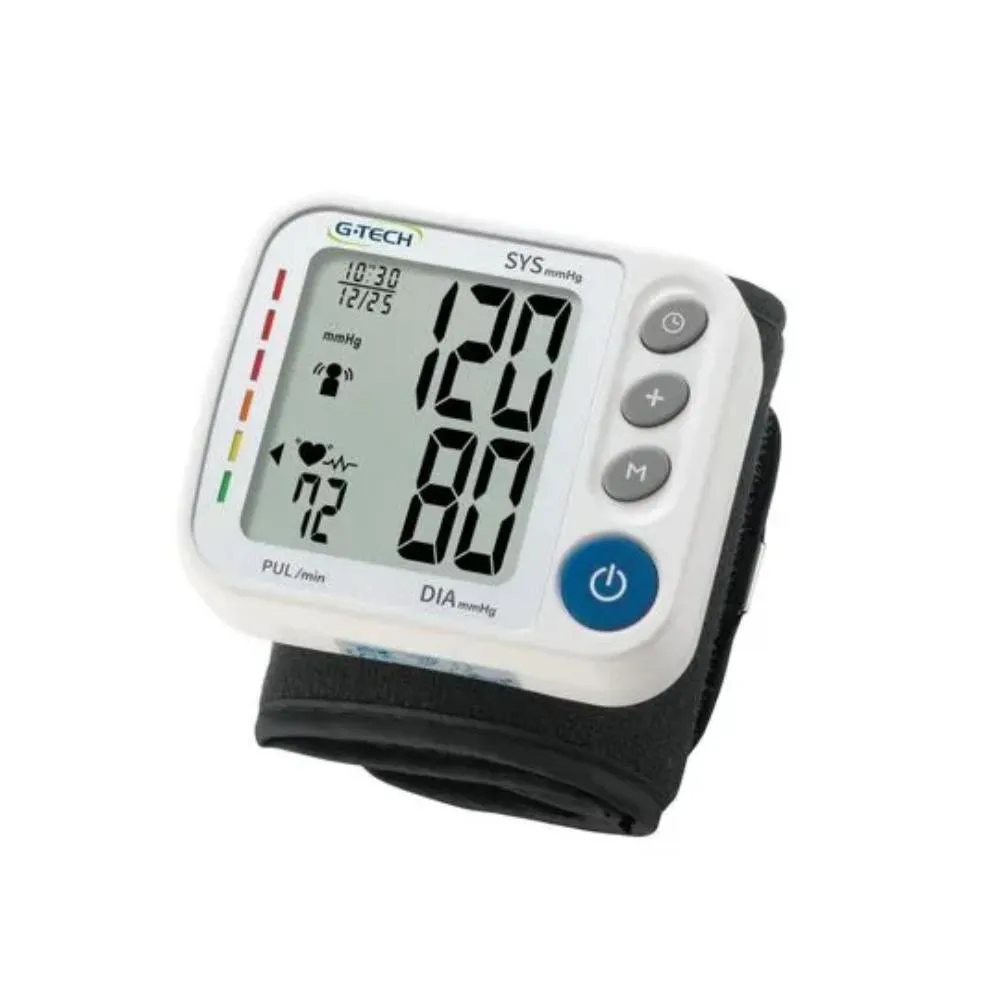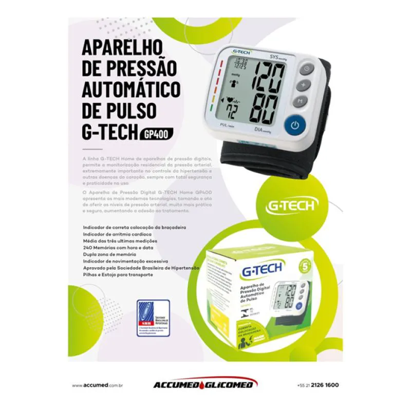 O novo aparelho de pressão digital automático de pulso G-Tech é uma solução completa para medição da pressão arterial. Além das medições tradicionais de pressão arterial e frequência cardíaca, possui uma série de outros benefícios, como: Memória para 120 resultados, com zonas independentes para três usuários, indicador de arritmia cardíaca e indicador gráfico de nível de hipertensão; Seu Design é moderno, fácil de utilizar e extremamente compacto, facilitando o transporte; Todas essas funções permitem um acompanhamento completo dos níveis de pressão arterial, sempre contando com a qualidade e segurança da marca G-Tech