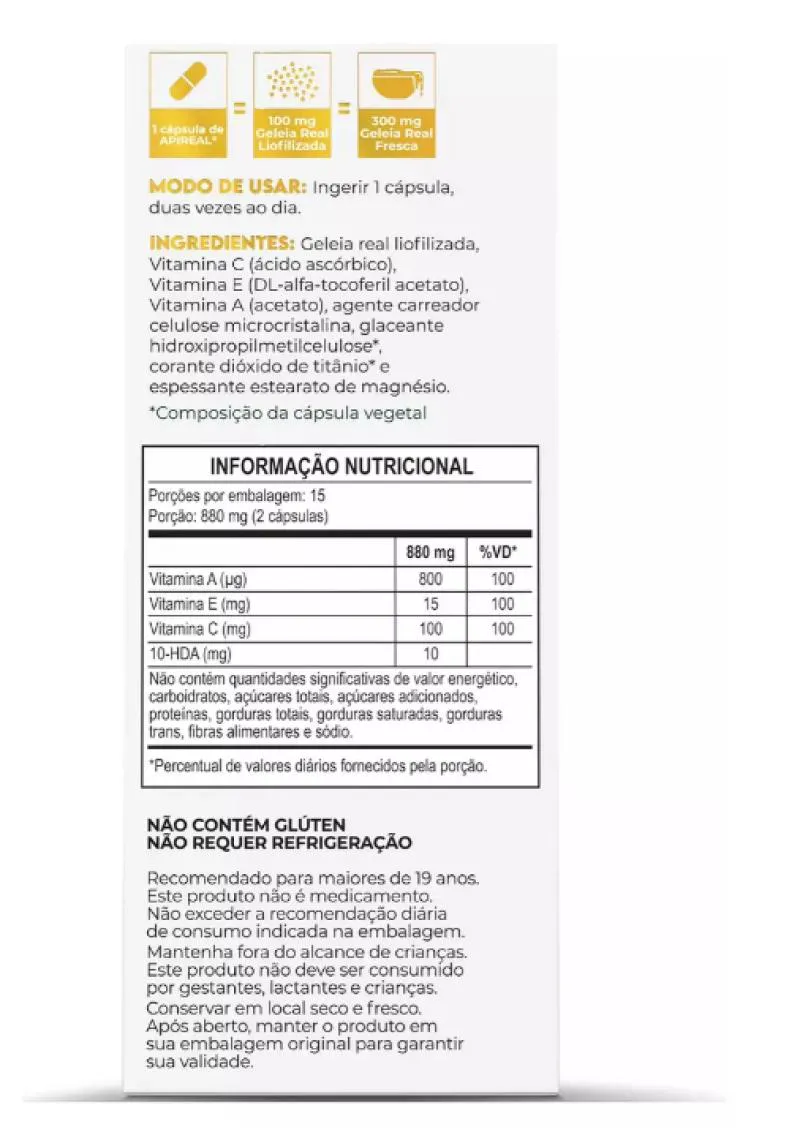 - Equivale à geléia real fresca em cápsulas.