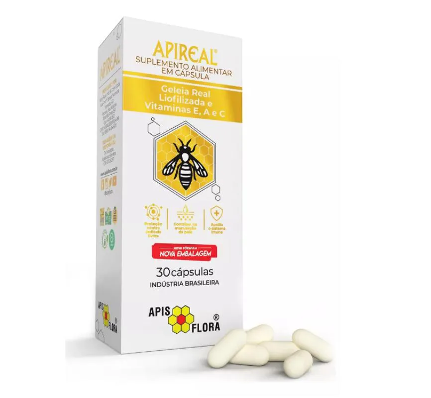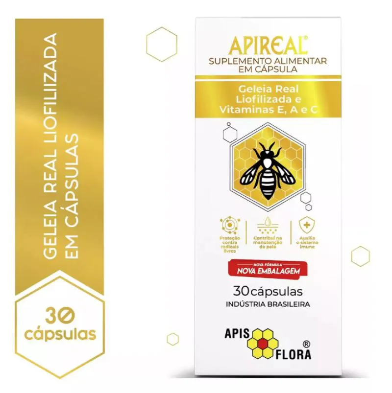 APIREAL - GELÉIA REAL LIOFILIZADA com VITAMINAS E, A e C em Cápsulas - Marca: ÁPIS FLORA KIT com 3 Caixinhas... totalizando 90 Cápsulas. A Geléia Real é uma substância produzida pelas abelhas jovens operárias com o objetivo de alimentar a abelha rainha durante toda a sua vida APIREAL ainda contém as vitaminas E e C, antioxidantes lipo e hidrossolúveis e a vitamina a, essenciais para a manutenção do organismo. APIREAL é elaborada com geléia real liofilizada à baixa temperatura (-25 °C), o que permite manter a sua estabilidade e valor biológico, mesmo em temperatura ambiente. APIREAL apresenta a praticidade de transporte e consumo com as mesmas características e atividades da geléia real fresca, uma vez que cada cápsula de APIREAL contém 100mg de geléia real liofilizada, o que equivale a 300mg de geléia real fresca.