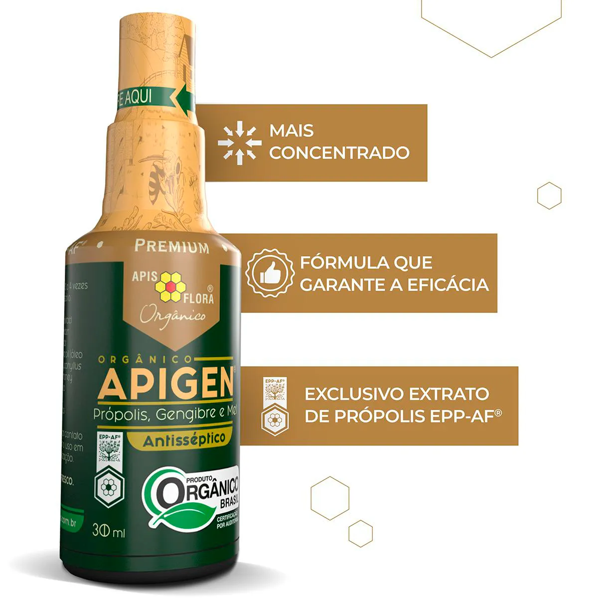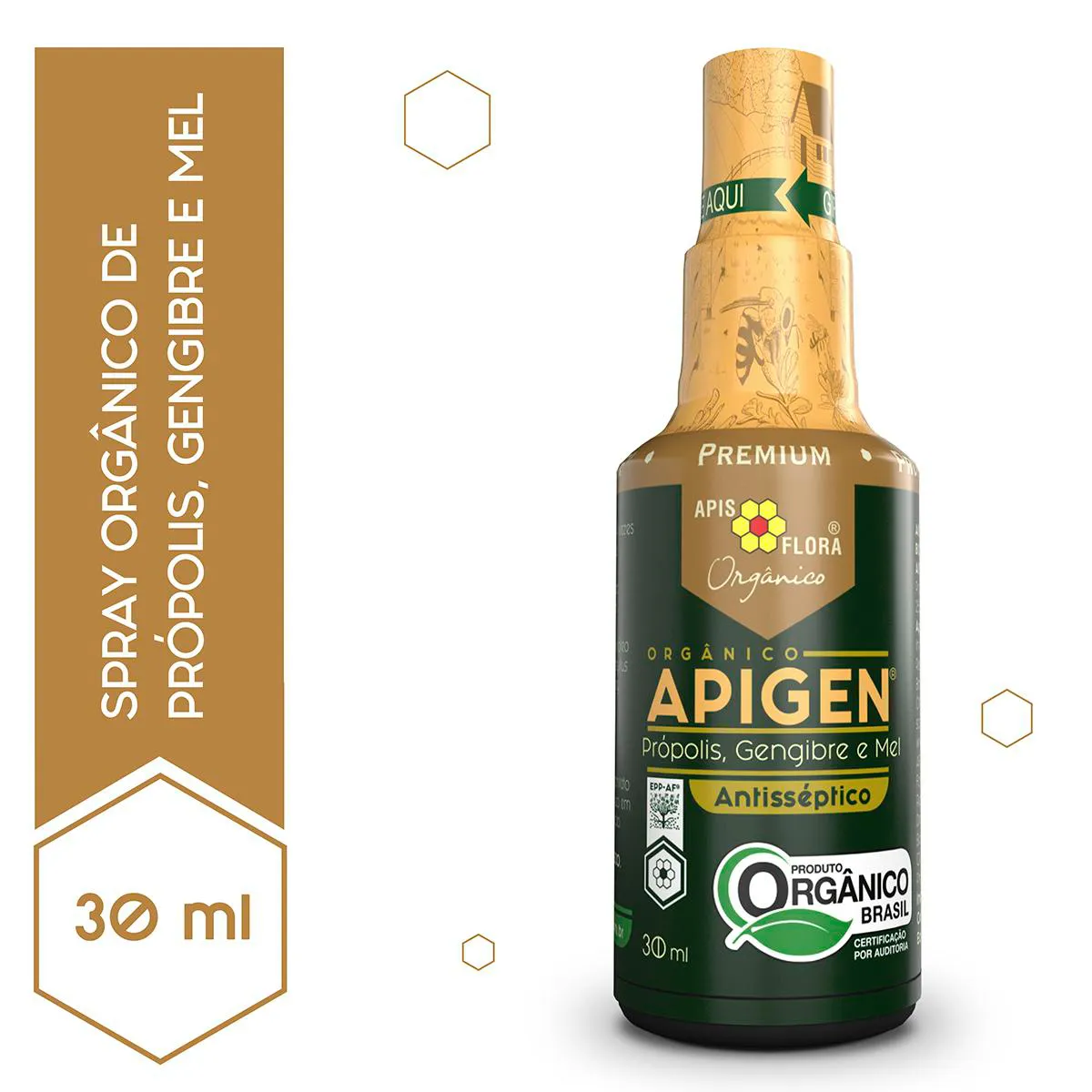 O Spray para Garganta Própolis, Mel e Gengibre Apis Flora Apigen Orgânico é um spray antisséptico bucal composto por mel polifloral, extrato de própolis EPP-AF® e extrato de gengibre (Zingiber officinale). Desenvolvido para combater os principais microrganismos que atuam na boca e na garganta, como os dos gêneros Streptococcus e Staphylococcus, o produto oferece ação cicatrizante, anti-inflamatória, antimicrobiana, expectorante e antitussígena.