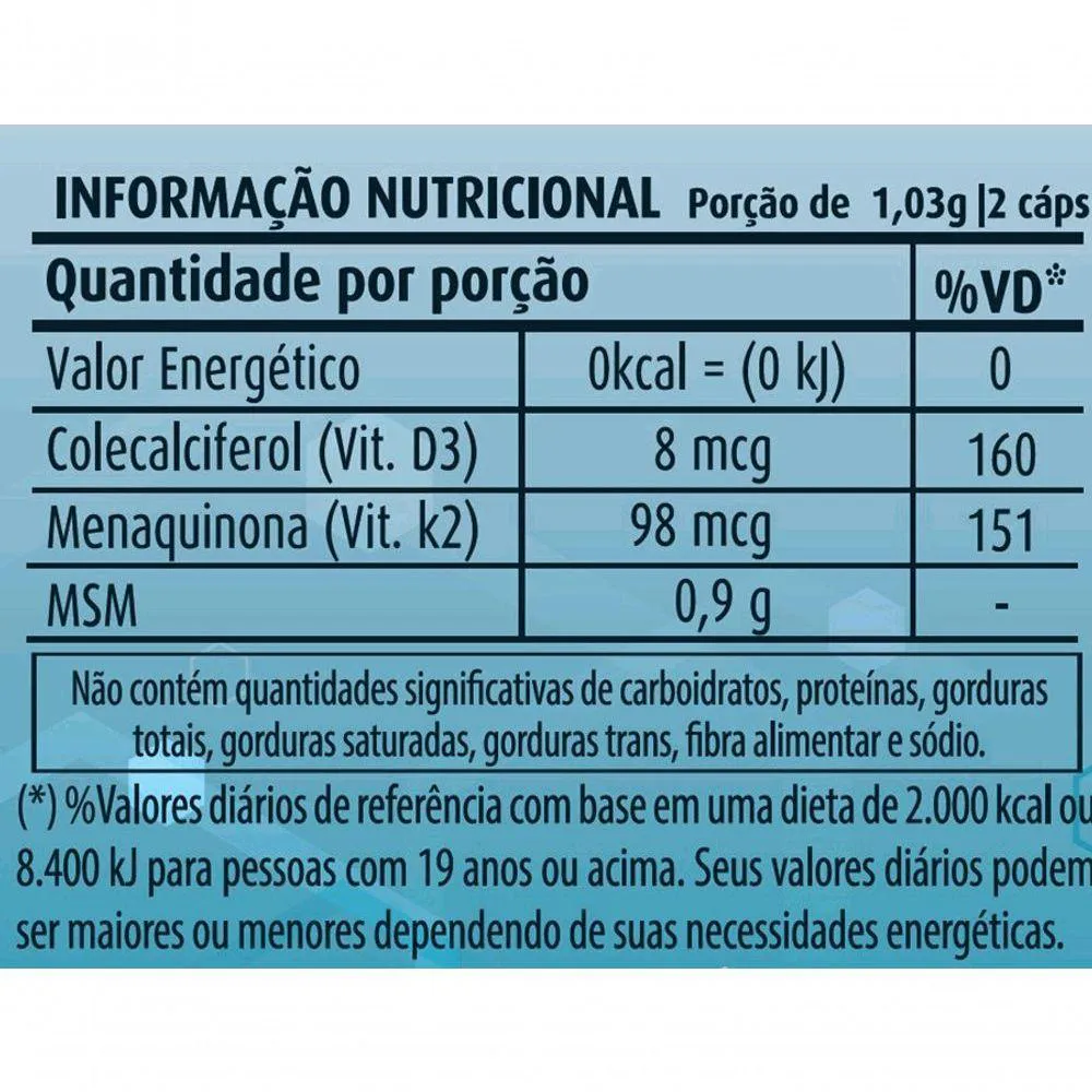 Informação Nutricional Artro - MSM 515mg (60 caps) - ApisnutriPorção de 1,03g (2 cápsulas)Quantidade por porção%VD(*)Valor Energético0kcal = 0KJ 0Calecalciferol (Vit. D3)8mcg160Menaquinona ((Vit. K2)98mcg151MSM0,9G*** % Valores Diários com base em uma dieta de 2.000Kcal ou 8400kJ. Seus valores diários podem ser maiores ou menores dependendo das suas necessidades energéticas. Obs: Pode haver pequenas variações na informação nutricional, de acordo com o sabor.