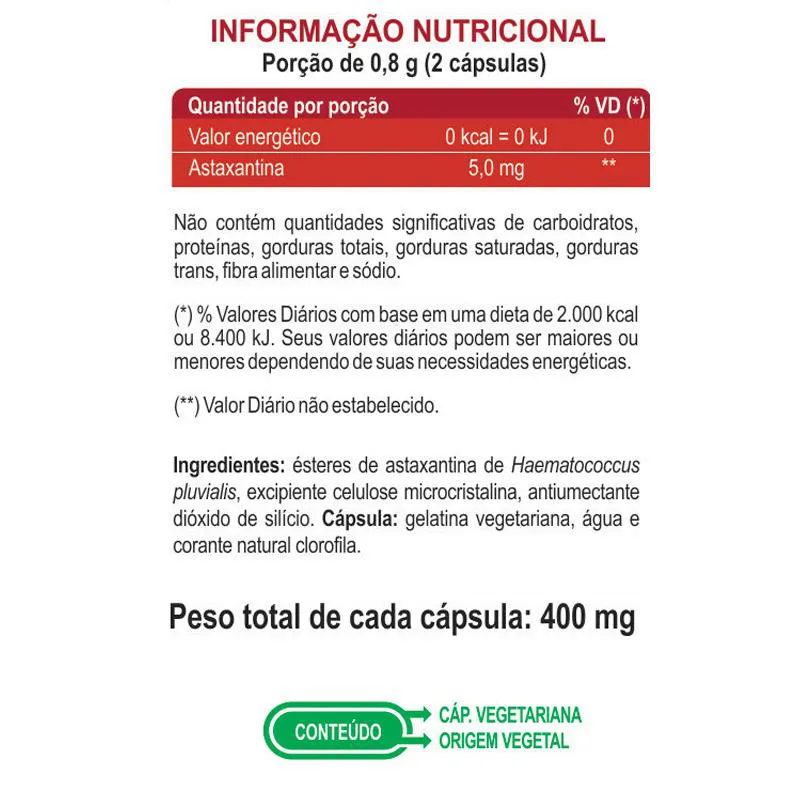 Astaxantina 400mg Unilife 60 cápsulas Ingredientes: Ésteres de Astaxantina, Excipiente Celulose Microcristalina, Antiumectante Dióxido de Silício. Cápsula: Gelatina Vegetáriana, Água e Corante Natural Clorofila. Modo de Ingestão: É Recomendado a Ingestão de uma Cápsula 2 Vezes ao Dia. Ingerir com Líquido. É Recomendado o Uso para Maiores de 19 Anos. Não Deve ser Consumido por Gestantes, Lactantes ou Crianças.