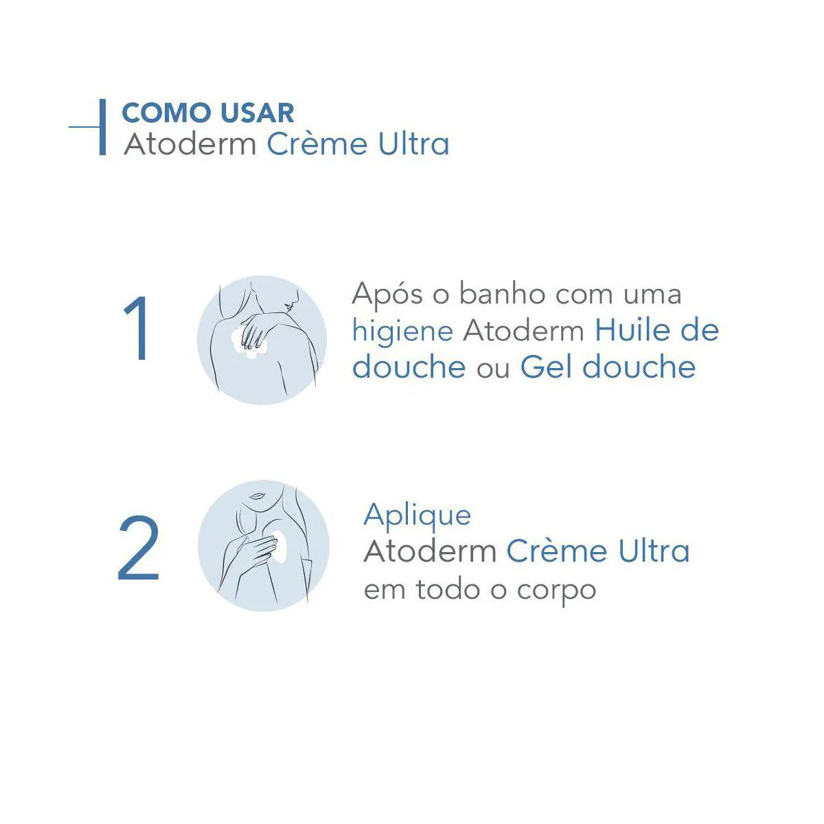 Após a limpeza da pele com o produto de sua preferência, aplique o Atoderm Ultra sobre a pele e massageie delicadamente até a completa absorção do produto.