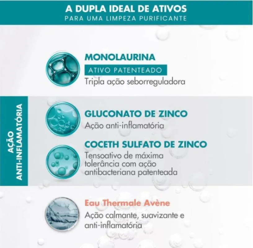 Benefícios Limpa profundamente e refresca. Elimina a oleosidade. Reduz as bactérias causadoras da acne. Não contém sabão, minimizando o gatilho da produção de sebo. Sem parabenos. Hipoalergênico.