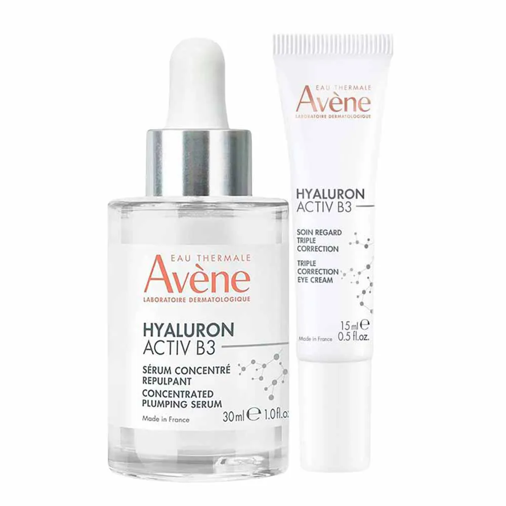 O Avène Hyaluron Activ B3 Kit é composto por dois produtos inovadores: o Creme Anti Idade Hyaluron Activ B3 Olhos e o Sérum Concentrado Preenchedor Hyaluron Activ B3 . Ambos são formulados com ingredientes de alta performance como ácido hialurônico puro, niacinamida (6%), extrato de Haritaki e sulfato de Dextran. Estes componentes atuam diretamente nas causas do envelhecimento da pele, estimulando as células cutâneas e prolongando sua longevidade.
