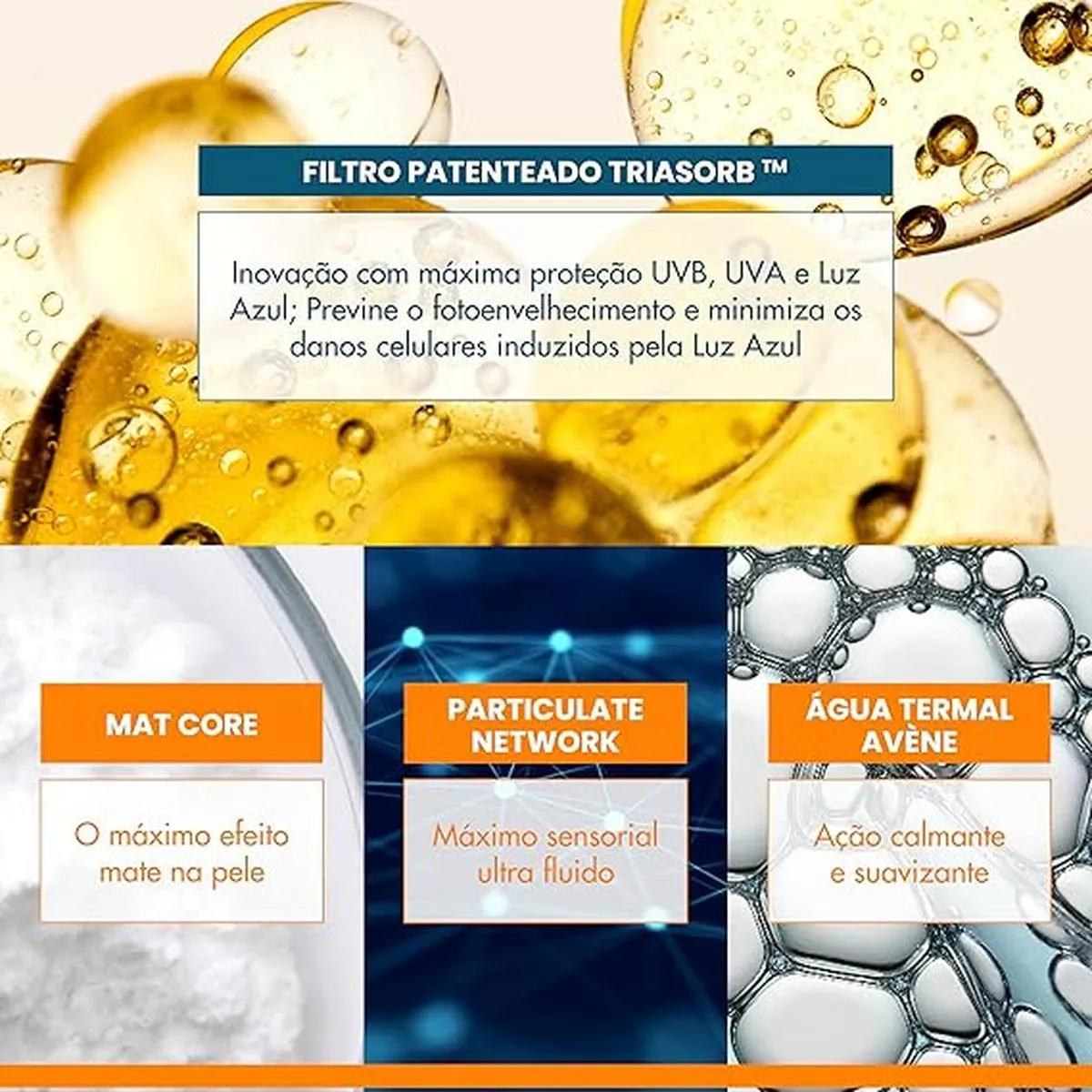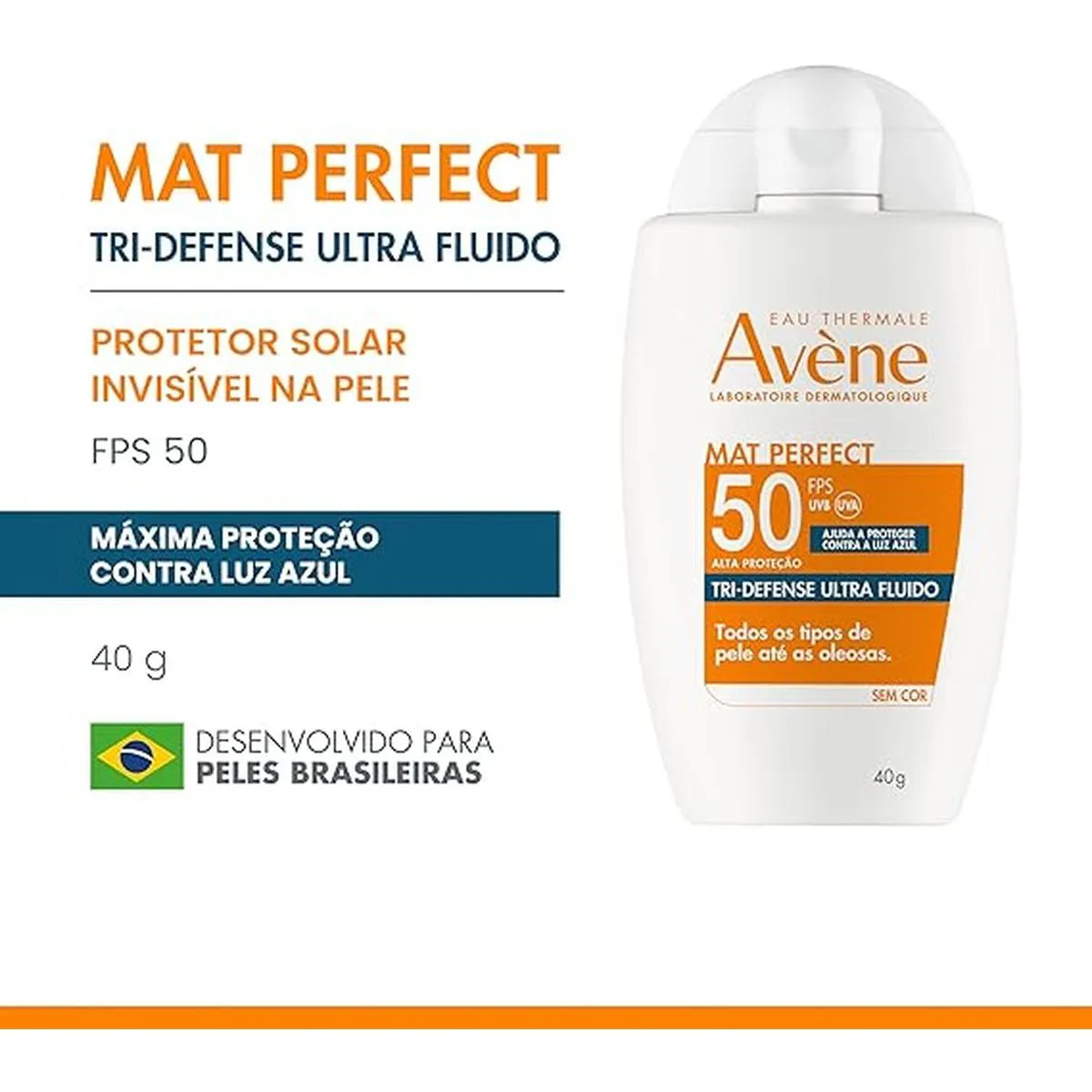 Avène Mat Perfect Tri‑Defense Ultra Fluido Sem Cor FPS 50 – 40 g O protetor solar facial Mat Perfect Tri‑Defense da Avène oferece proteção muito alta (FPS 50) contra raios UVB, UVA (curtos e longos) e luz azul, especialmente desenvolvido para peles sensíveis a oleosas. Sua fórmula ultraleve promove toque seco, controle de oleosidade e acabamento invisível — sem resíduos brancos, em qualquer fotótipo. Características: