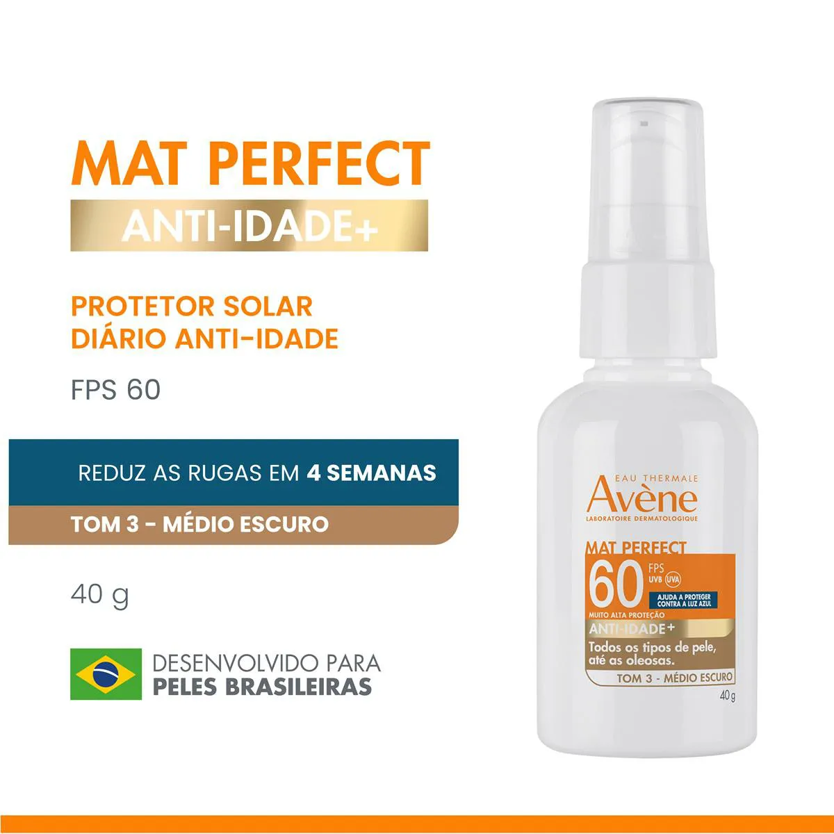 - Protetor Solar Mat Perfect Anti-idade FPS60 protege contra raios UVB, UVA e luz azul.