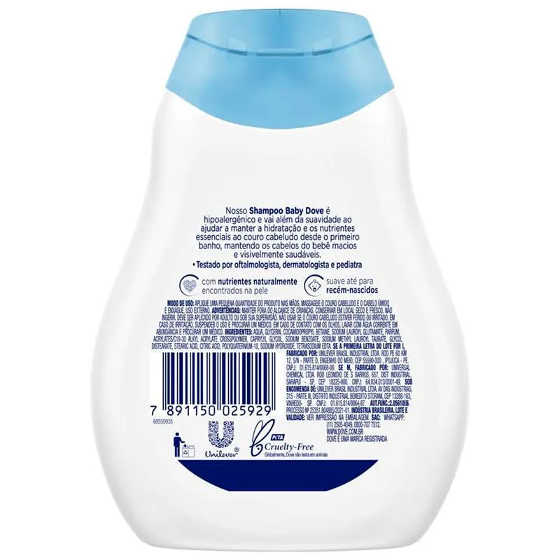 O Shampoo Baby Dove Hipoalergênico vai além da limpeza suave: ele mantém a hidratação natural e repõe nutrientes essenciais ao couro cabeludo desde o primeiro banho, deixando os cabelos do bebê macios, limpos e visivelmente saudáveis. Com pH neutro e nutrientes naturalmente encontrados na pele do bebê, sua fórmula hipoalergênica, suave e sem lágrimas oferece cuidado diário que respeita a delicadeza da pele e dos fios. Possui fragrância leve e delicada, especialmente desenvolvida para a sensível pele dos pequenos. Dermatologicamente, oftalmologicamente e pediatricamente testado, o shampoo Baby Dove garante segurança e suavidade em cada uso.Benefícios