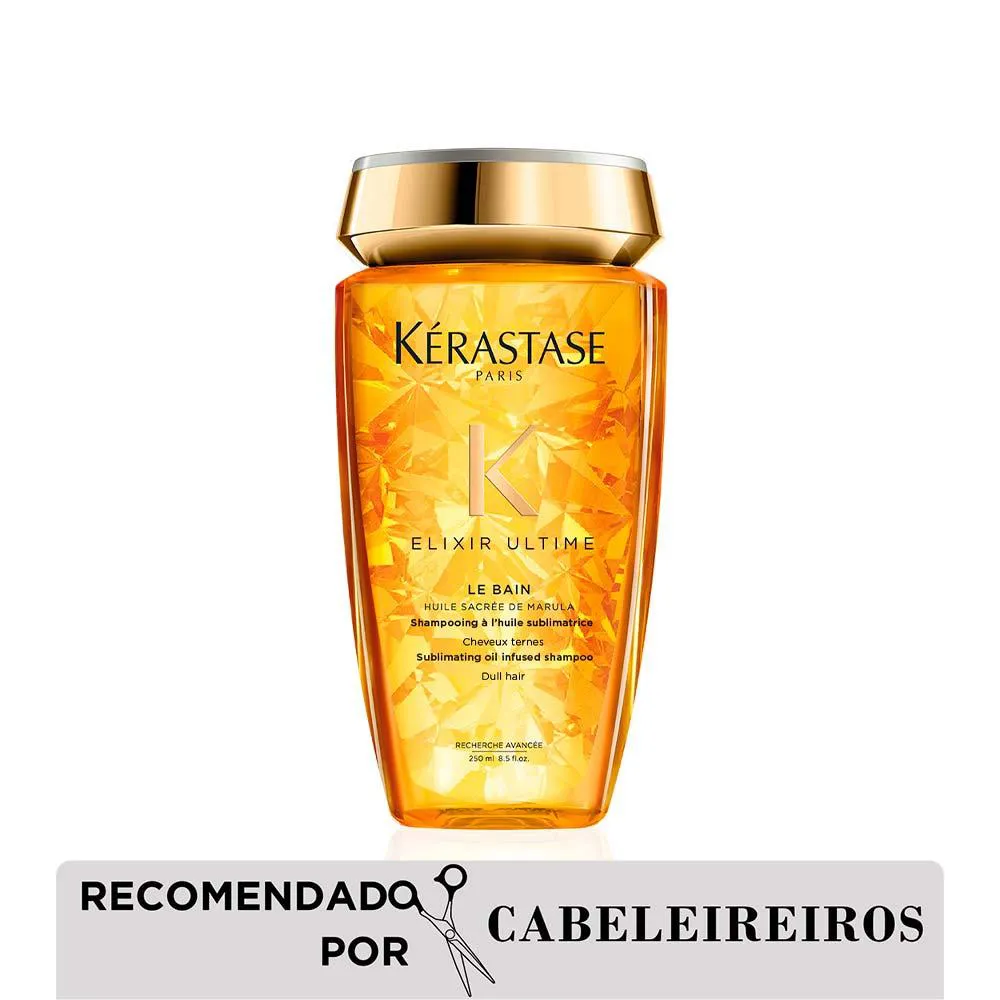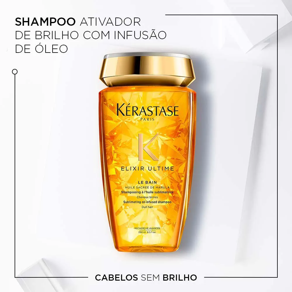 Bain Elixir Ultime Kérastase é um shampoo infundido com óleo Marula é uma fórmula ideal para cabelos sem brilho. O shampoo de espuma arejado e rico revive a fibra capilar nutrindo-a generosamente com todos os nutrientes necessários para uma sensação sedosa. Ele purifica e elimina partículas de resíduos e poluentes para eliminar elementos embotados.
