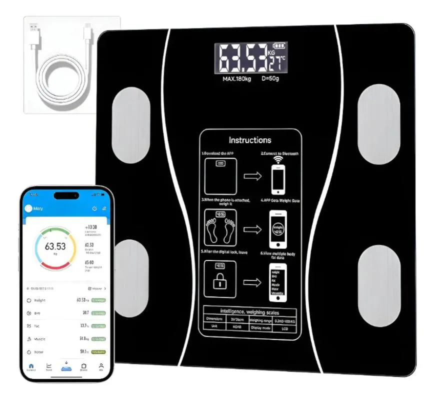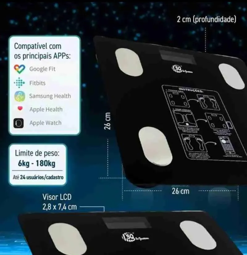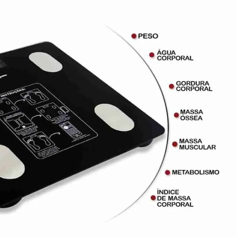 Descrição: A Balança Digital Corporal com Bioimpedância e Aplicativo Bluetooth é um dispositivo avançado projetado para fornecer informações detalhadas sobre a composição corporal de um indivíduo. Algumas das principais características desse produto incluem: Medição da composição corporal: Além de medir o peso total, essa balança utiliza a tecnologia de bioimpedância para calcular informações como a porcentagem de gordura corporal, massa muscular, massa óssea e nível de água no corpo. Essas medições são úteis para acompanhar o progresso de uma dieta ou programa de exercícios. Conectividade Bluetooth: A balança é equipada com tecnologia Bluetooth, permitindo que os dados de medição sejam transferidos automaticamente para um aplicativo de smartphone dedicado. Isso facilita o registro e o acompanhamento de suas estatísticas ao longo do tempo. Aplicativo dedicado: A balança acompanha um aplicativo específico para gerenciar os dados de medição. Esse aplicativo oferece gráficos e insights adicionais sobre sua composição corporal, além de permitir a configuração de metas e acompanhamento do progresso. Perfil de usuários múltiplos: A balança com bioimpedância permite criar perfis de usuários diferentes. Isso é especialmente útil para famílias ou grupos de pessoas que desejam acompanhar seus dados individuais de composição corporal. Visor de fácil leitura: A balança normalmente possui um visor digital de fácil leitura que exibe o peso e outras medições de forma clara e nítida. Design moderno e compacto: O produto geralmente apresenta um design moderno e elegante, ocupando pouco espaço em sua casa. alimentação por pilhas: A balança é alimentada por pilhas, o que a torna portátil e fácil de usar em qualquer lugar da casa. Lembre-se de ler atentamente o manual de instruções do produto para garantir o uso correto e a calibração adequada da balança. Especificações: – Duas unidades de medida: kg/lb – Vidro Temperado. – Peso MÁXIMO do usuário 140 Kg – Medidas Aproximadas: 26 x 26 x 2,15 cm – Alimentada por 2 pilhas AAA (Não inclusas).