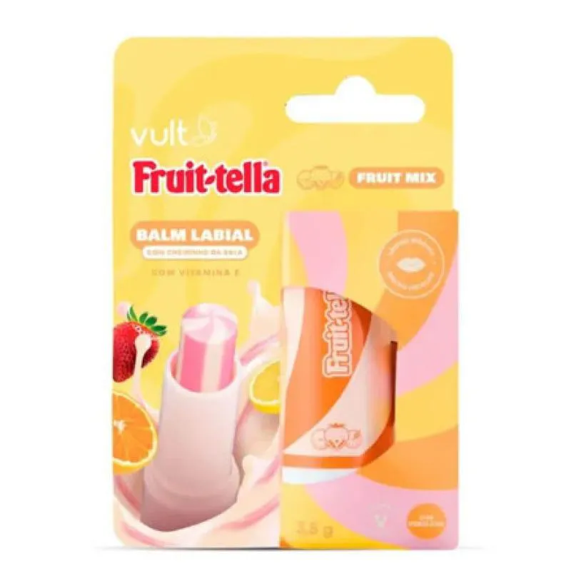 Balm Vult Fruit-tella Fruit Mix 3,5g - O Balm Labial Vult Fruit-tella Fruit Mix é a combinação perfeita de hidratação e prazer sensorial. Com uma textura cremosa e um acabamento suave, este balm proporciona lábios macios e confortáveis a cada aplicação. Sua fórmula é enriquecida com vitamina e, que não só nutre, mas também confere um brilho incolor irresistível, além do encantador aroma da famosa bala Fruit-tella, trazendo um toque nostálgico a cada uso.