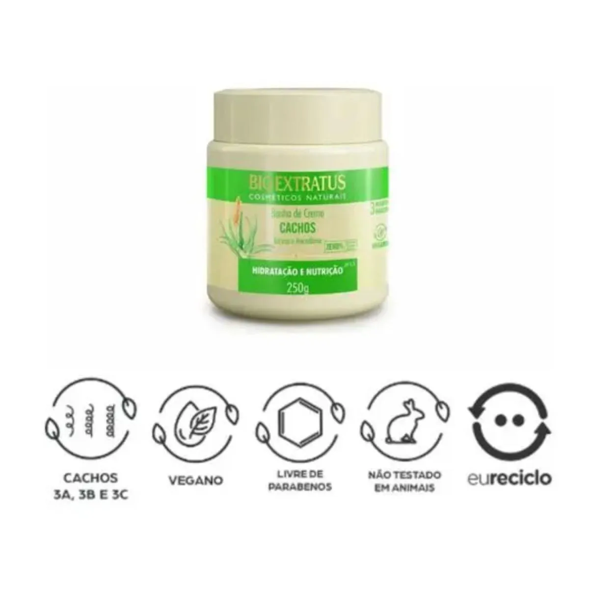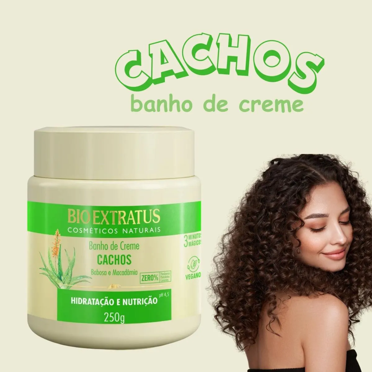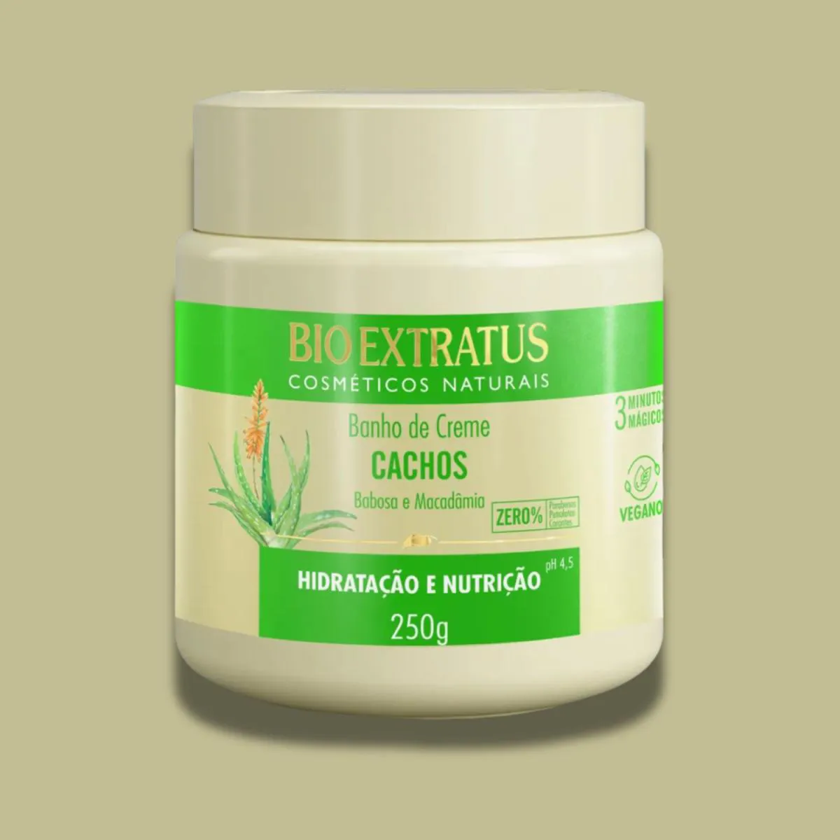 banho de Creme 250g Cachos – Bio Extratus O Banho de Creme 250g Cachos da Bio Extratus é um tratamento nutritivo desenvolvido especialmente para cabelos cacheados, ondulados e crespos. Sua fórmula rica em ativos naturais promove hidratação intensa, definição, brilho e maciez, deixando os fios saudáveis e fáceis de pentear. Diferenciais: · Hidratação profunda e nutrição para cabelos ressecados. · Realça e define cachos e ondulações naturais. · Confere brilho, maciez e maleabilidade aos fios. · Fórmula com ativos vegetais que fortalecem a fibra capilar. Modo de uso: