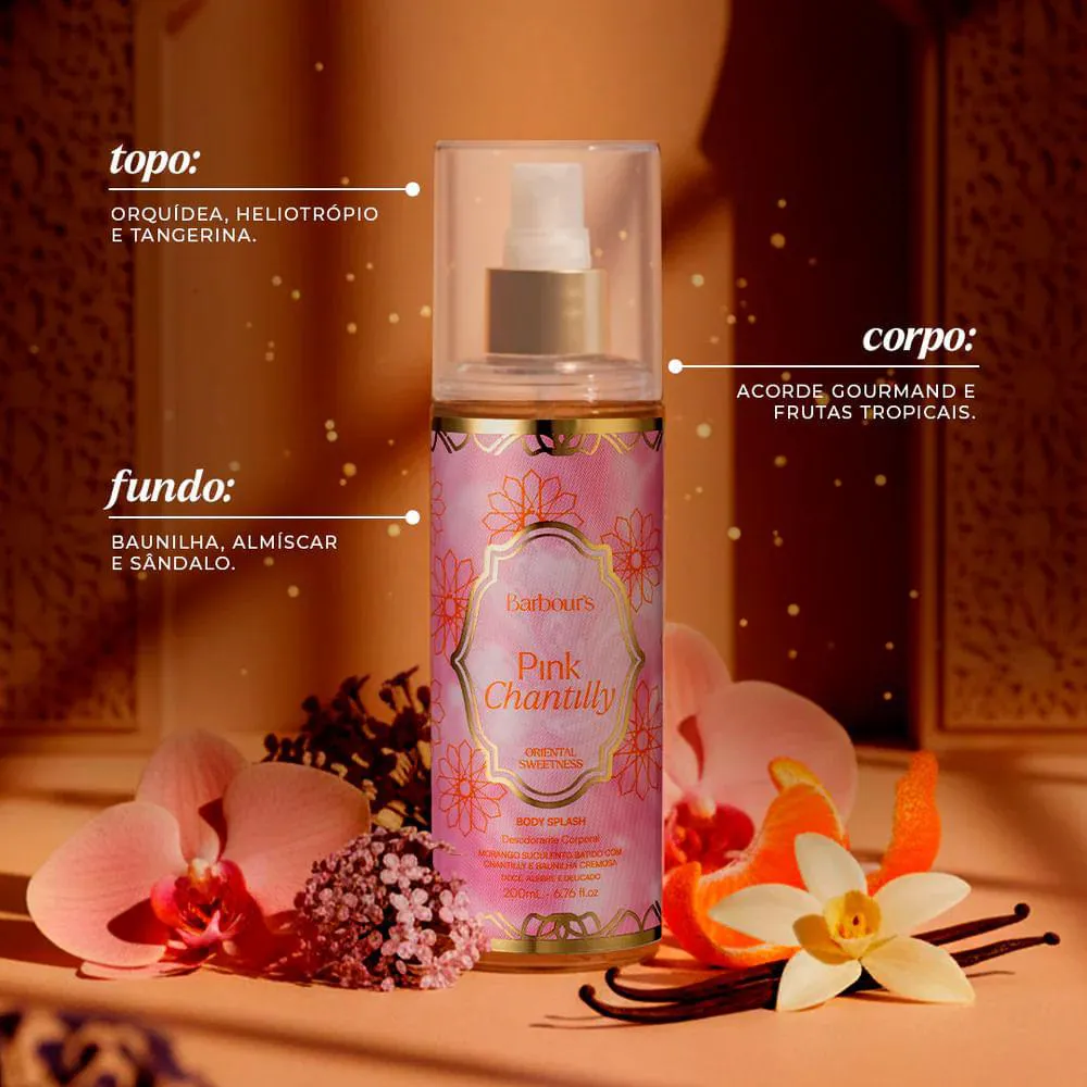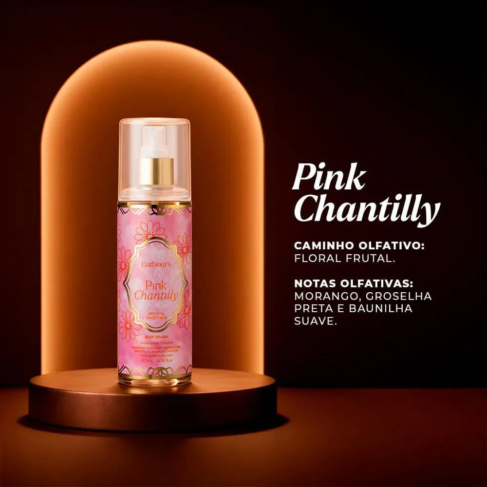 Barbour s Beauty Pink Chantilly é um body splash gourmand e envolvente criado para perfumar suavemente a pele com uma fragrancia adocicada, cremosa e delicadamente feminina. Sua composicao inspira sensacoes de conforto e prazer, combinando frutas vermelhas suculentas com notas lactonicas e baunilha aveludada que criam uma aura doce sem ser pesada, ideal para uso diario e reaplicacoes frequentes. Desenvolvido para acompanhar rotinas descontraidas, momentos de lazer ou dias quentes, este body splash entrega frescor imediato aliado a um perfume delicado e viciante que permanece perceptivel por horas. Pink Chantilly transforma o cuidado corporal em uma experiencia sensorial prazerosa, deixando a pele suavemente aromatizada, luminosa e com toque doce irresistivel.