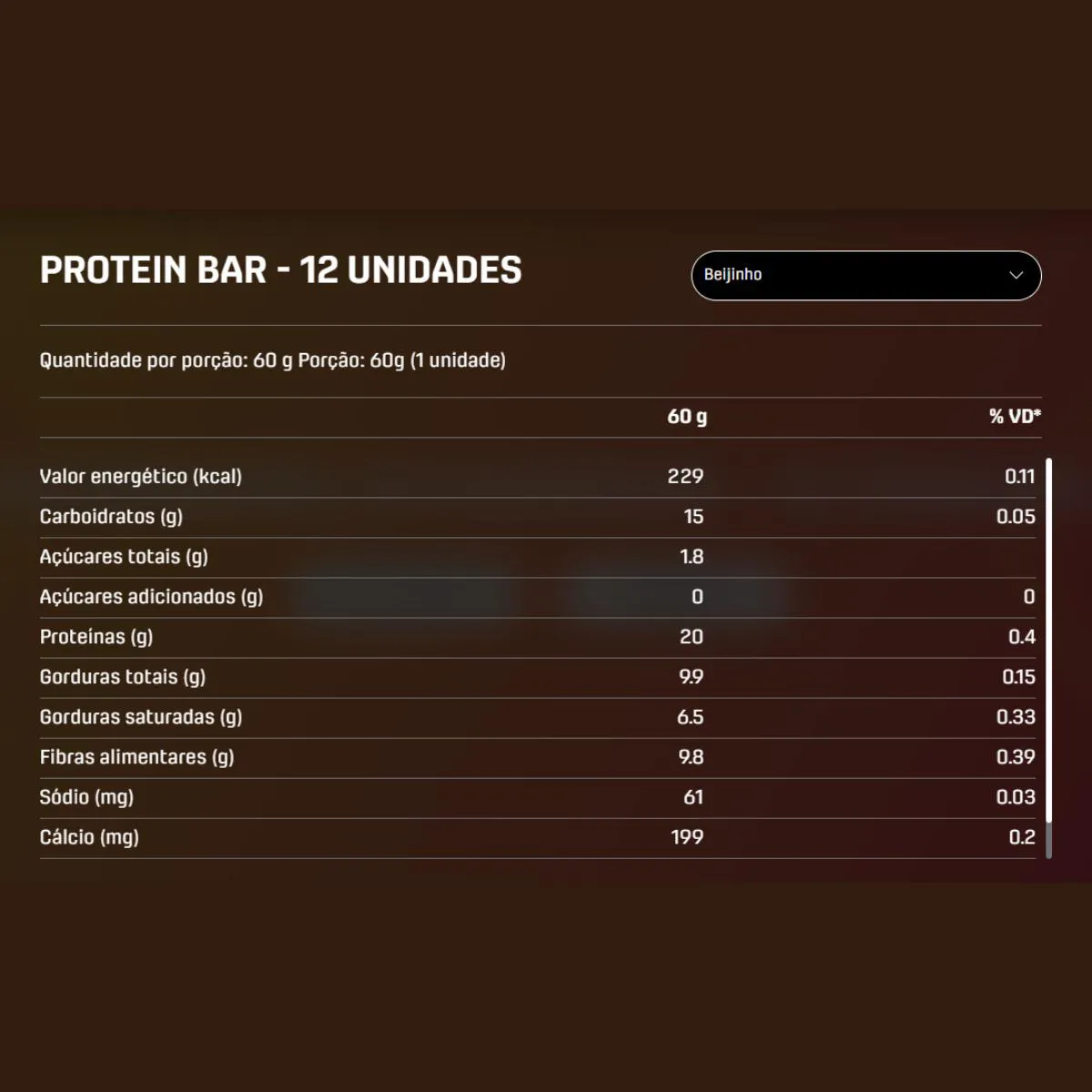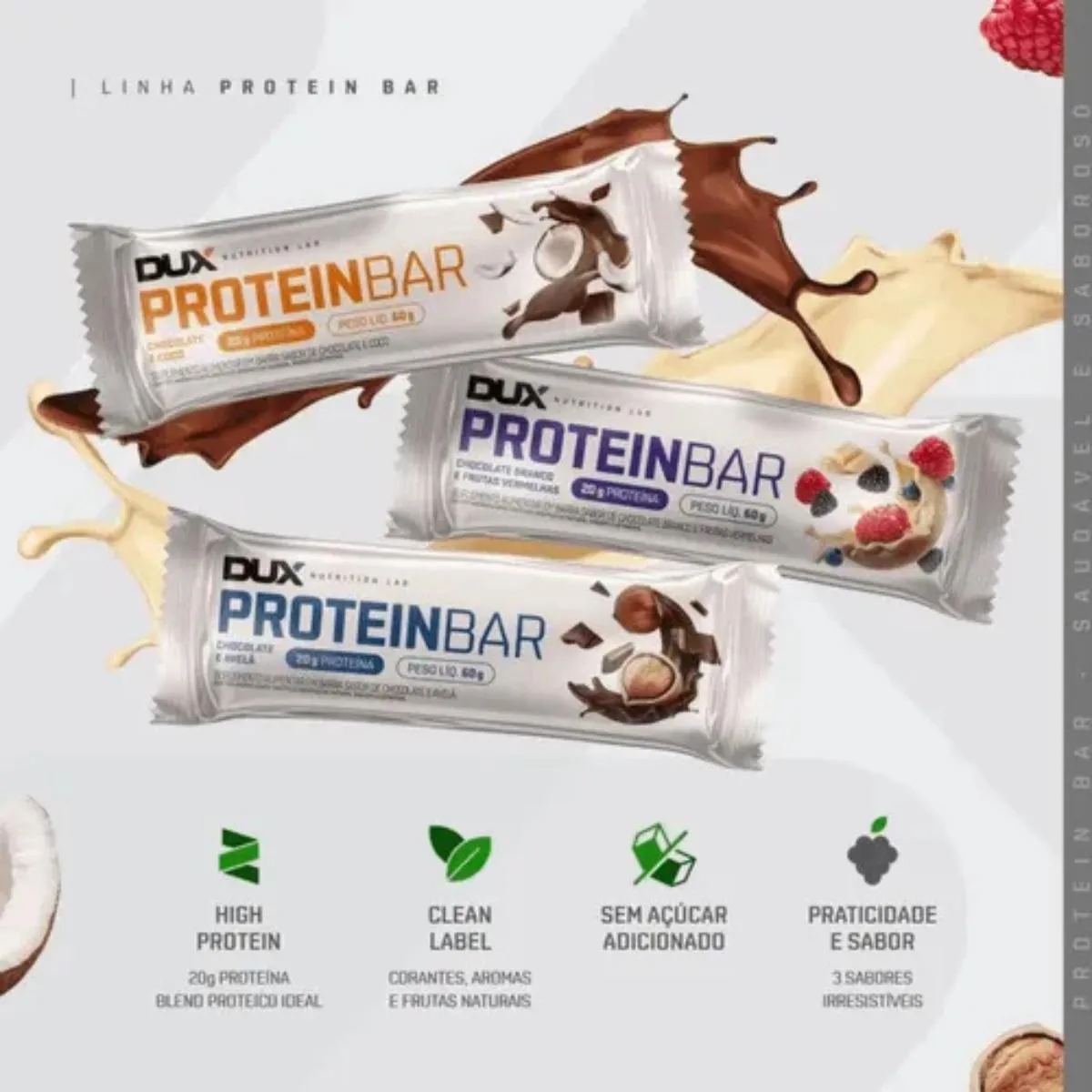 A barra perfeita com 20 g de proteína, desenvolvida a partir de um blend proteico premium, oferecendo um sabor irresistível. Feita com ingredientes de altíssima qualidade, é a escolha ideal para quem busca nutrição e prazer em cada mordida. Nossa Protein bar contém 20 g de proteína por barra, auxilia no ganho de massa muscular, controla o apetite e promove saciedade. Possui frutas ou nuts naturais, oferecendo um valor nutritivo ainda maior e um sabor incrível. É uma ótima escolha para atingir metas nutricionais diárias enquanto desfruta de um snack saboroso e funcional. A proteína é um macronutriente essencial porque fornece aminoácidos fundamentais para a construção e reparação do tecido muscular. Nosso Protein Bar composto por proteínas de alto valor biológico e uma combinação equilibrada de carboidratos e gorduras saudáveis, fornece energia de forma sustentada e contribuem para um estilo de vida saudável e ativo. Ingredientes: Blend de proteínas (proteína concentrada de leite, caseinato de cálcio e proteína de soro do leite isolada), cobertura sabor chocolate branco, xarope de tapioca, recheio sabor coco, colágeno hidrolisado, frutooligossacarídeos (FOS), gordura de palma, coco ralado, umectante, antioxidante, aromatizante, conservante e edulcorante. ALÉRGICOS: CONTÉM DERIVADOS DE soja E LEITE. PODE CONTER TRIGO, CEVADA, AVEIA, AMENDOIM, AMÊNDOA, AVELA E CASTANHA-DE-CAJU. CONTÉM LACTOSE. CONTÉM GLÚTEN.