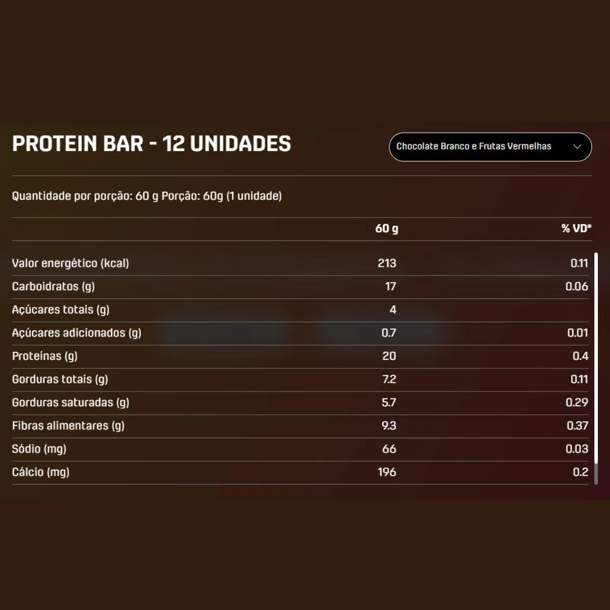 A barra perfeita com 20 g de proteína, desenvolvida a partir de um blend proteico premium, oferecendo um sabor irresistível. Feita com ingredientes de altíssima qualidade, é a escolha ideal para quem busca nutrição e prazer em cada mordida. Nossa Protein bar contém 20 g de proteína por barra, auxilia no ganho de massa muscular, controla o apetite e promove saciedade. Possui frutas ou nuts naturais, oferecendo um valor nutritivo ainda maior e um sabor incrível. É uma ótima escolha para atingir metas nutricionais diárias enquanto desfruta de um snack saboroso e funcional. A proteína é um macronutriente essencial porque fornece aminoácidos fundamentais para a construção e reparação do tecido muscular. Nosso Protein Bar composto por proteínas de alto valor biológico e uma combinação equilibrada de carboidratos e gorduras saudáveis, fornece energia de forma sustentada e contribuem para um estilo de vida saudável e ativo. Ingredientes: Blend de proteínas (proteína concentrada de leite, caseinato de cálcio e proteína de soro do leite isolada), cobertura sabor chocolate branco, xarope de tapioca, preparado de frutas, colágeno hidrolisado, frutooligossacarídeos (FOS), gordura de palma, morango liofilizado, umectante, corante, aromatizante, antioxidante, conservante e edulcorante. ALÉRGICOS: CONTÉM DERIVADOS DE soja E LEITE. PODE CONTER TRIGO, CEVADA, AVEIA, AMENDOIM, AMÊNDOA, AVELÃS E CASTANHA-DE-CAJU. CONTÉM LACTOSE. CONTÉM GLÚTEN. Sugestões de Uso: Da forma como preferir. A barrinha é perfeita para um impulso nutritivo de manhã, um lanche da tarde para aliviar a fome, antes do treino para mais energia e depois para recuperação muscular e até na ceia para garantir a saciedade antes de dormir.