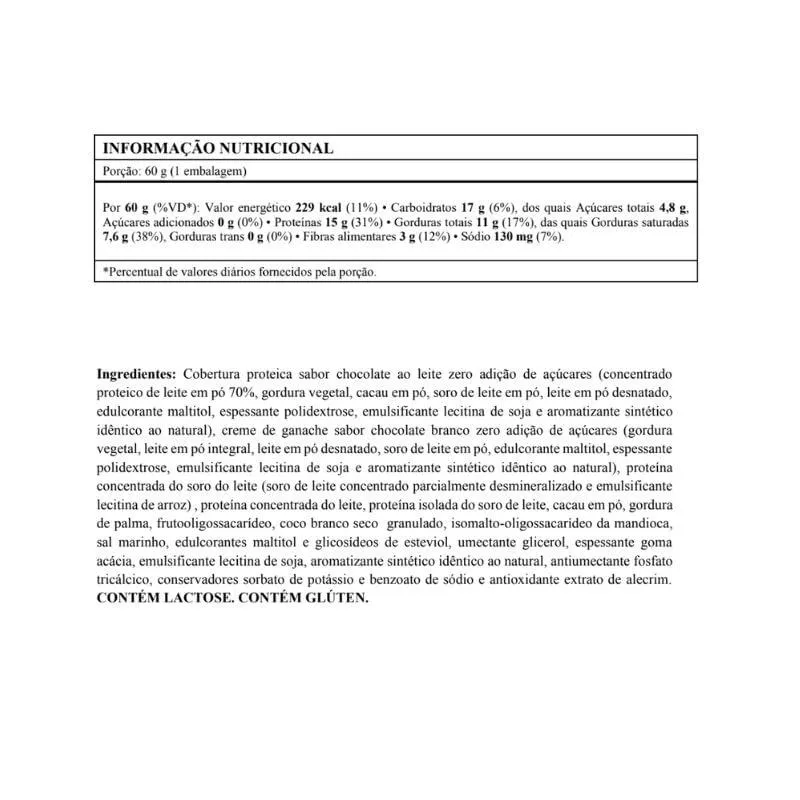 Alérgicos: Contém glúten, soja, lactose e derivados do leite. Pode conter: amendoim, amêndoas, avelã, aveia, castanha do brasil, castanha de caju, centeio, cevada, macadâmias, nozes, pecãs, pistache, pinoli e ovos.Sugestão de consumo: