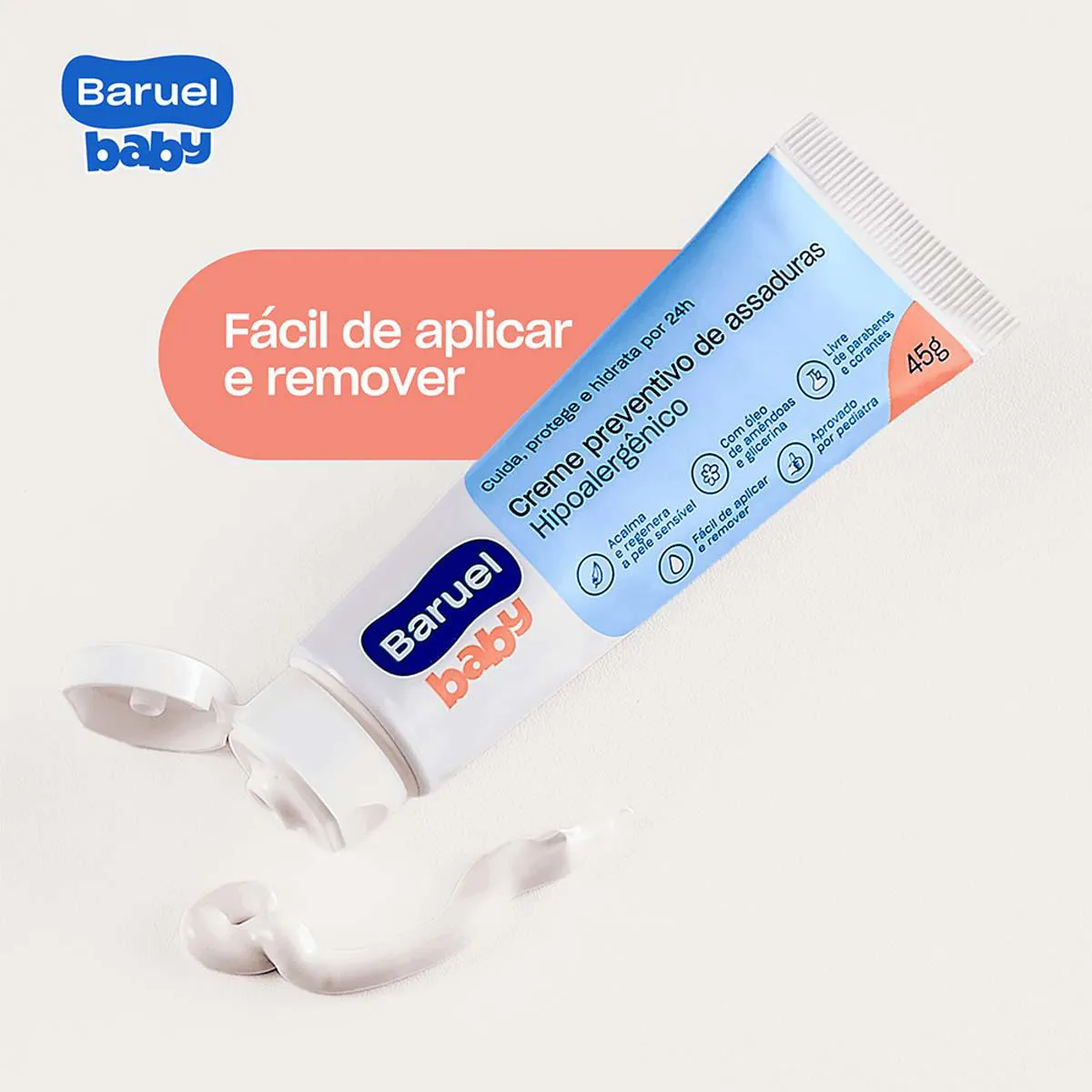 O Baruel Baby é um Creme Preventivo de assaduras fácil de aplicar e remover, desenvolvido especialmente para a pele sensível do bebê.