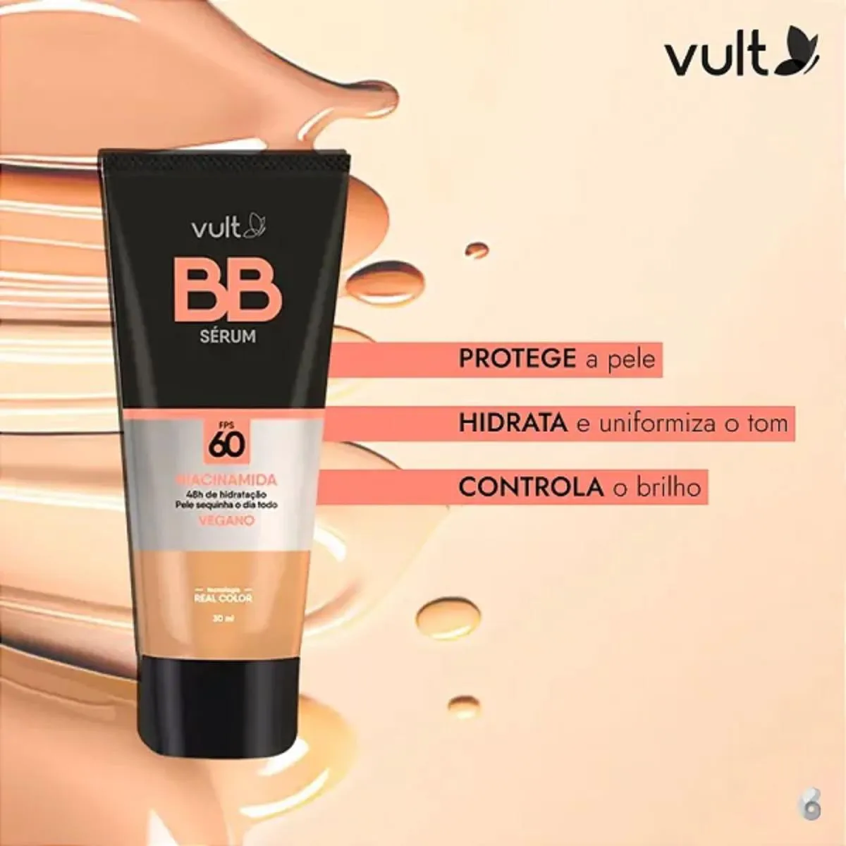 A Base BB Sérum FPS 60 da Vult – Cor V230 (Bege Médio) é um produto multifuncional que combina cuidados com a pele e maquiagem, ideal para o uso diário.