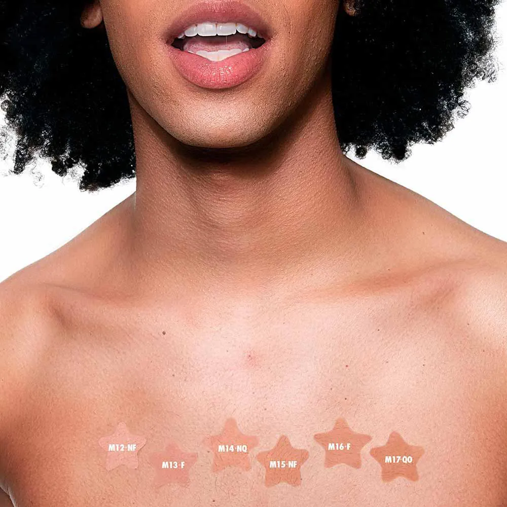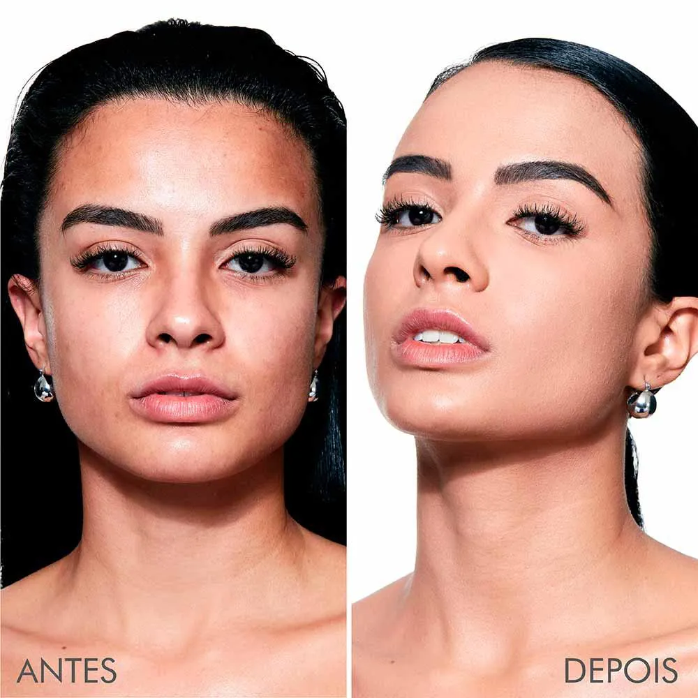 3. Para um acabamento mais natural, finalize dando leves batidas com uma esponja macia. Dica: Para um resultado ainda mais incrível, utilize outros tons do mesmo produto para corrigir, contornar e iluminar. Precauções: