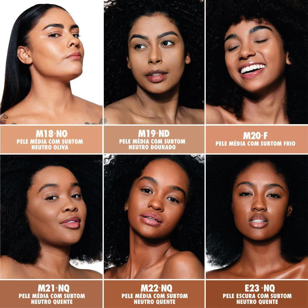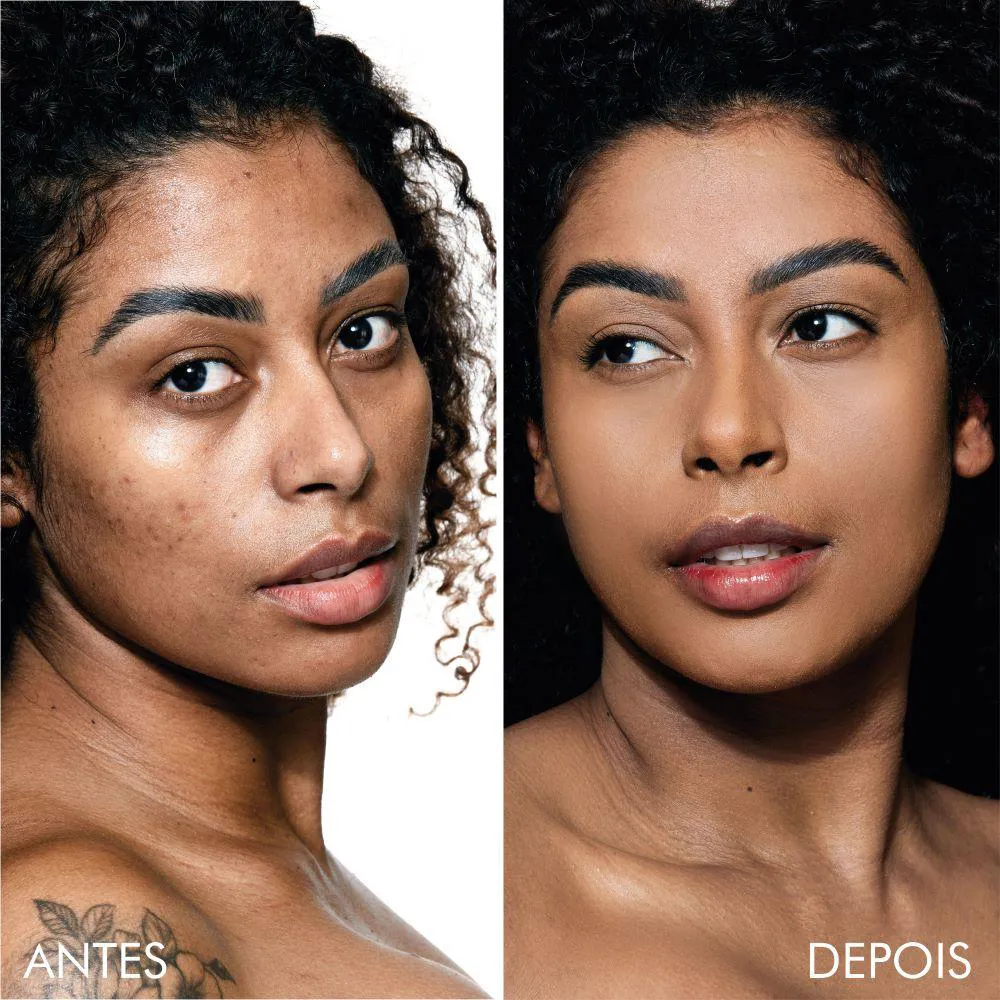 3. Para um acabamento mais natural, finalize dando leves batidas com uma esponja macia. Dica: Para um resultado ainda mais incrível, utilize outros tons do mesmo produto para corrigir, contornar e iluminar. Precauções: