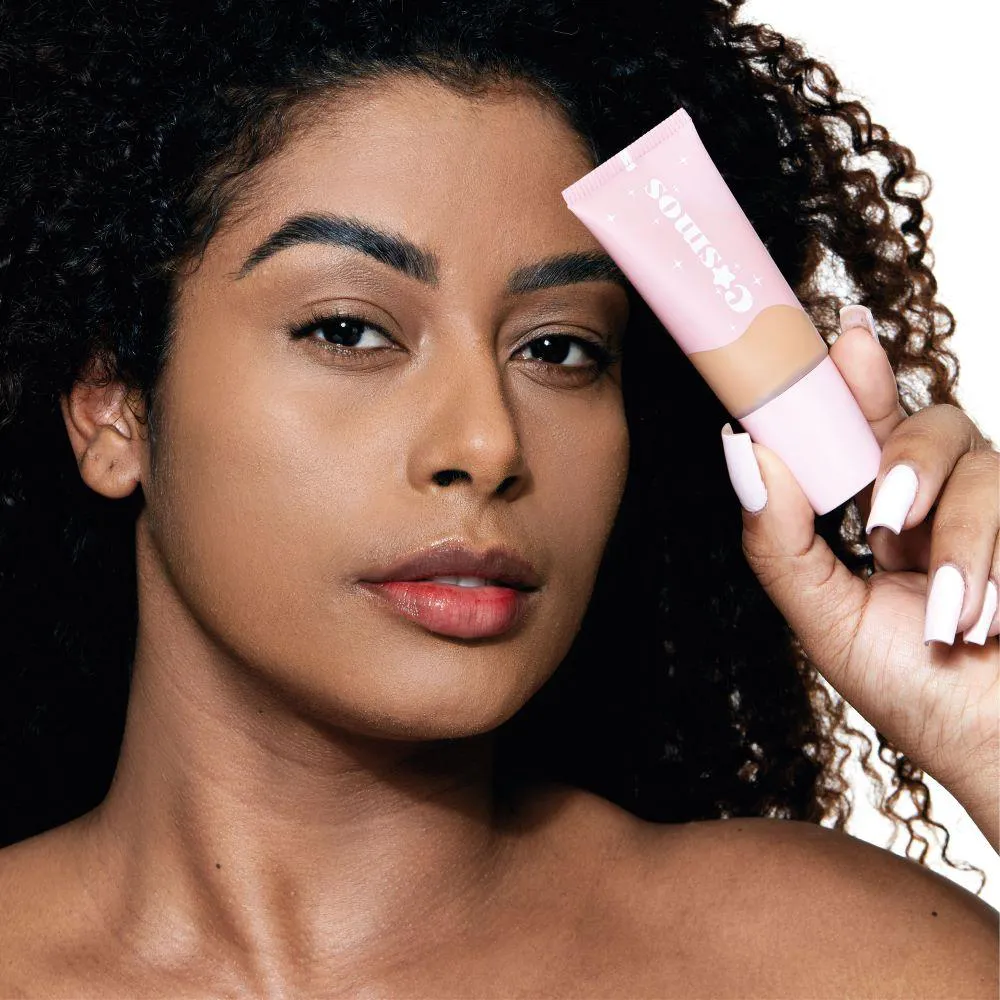 A Base Cosmos By Karen Bachini é ideal para quem busca efeito semi matte, natural e confortável, unindo proteção solar eficaz, inclusive com ativos que ajudam a controlar a oleosidade e disfarce dos poros.