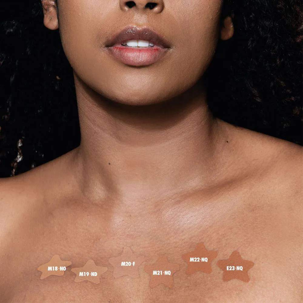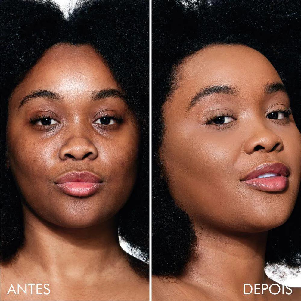 3. Para um acabamento mais natural, finalize dando leves batidas com uma esponja macia. Dica: Para um resultado ainda mais incrível, utilize outros tons do mesmo produto para corrigir, contornar e iluminar. Precauções: