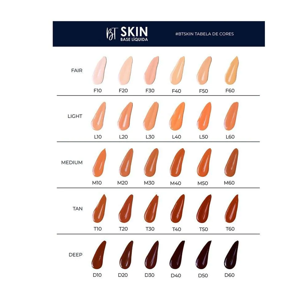 A BT Skin possui textura aveludada e cobertura leve a média com incrível acabamento, permitindo a construção de camadas, sem perder o efeito natural. Atua como tratamento antissinais, garantindo mais firmeza e elasticidade para a pele.