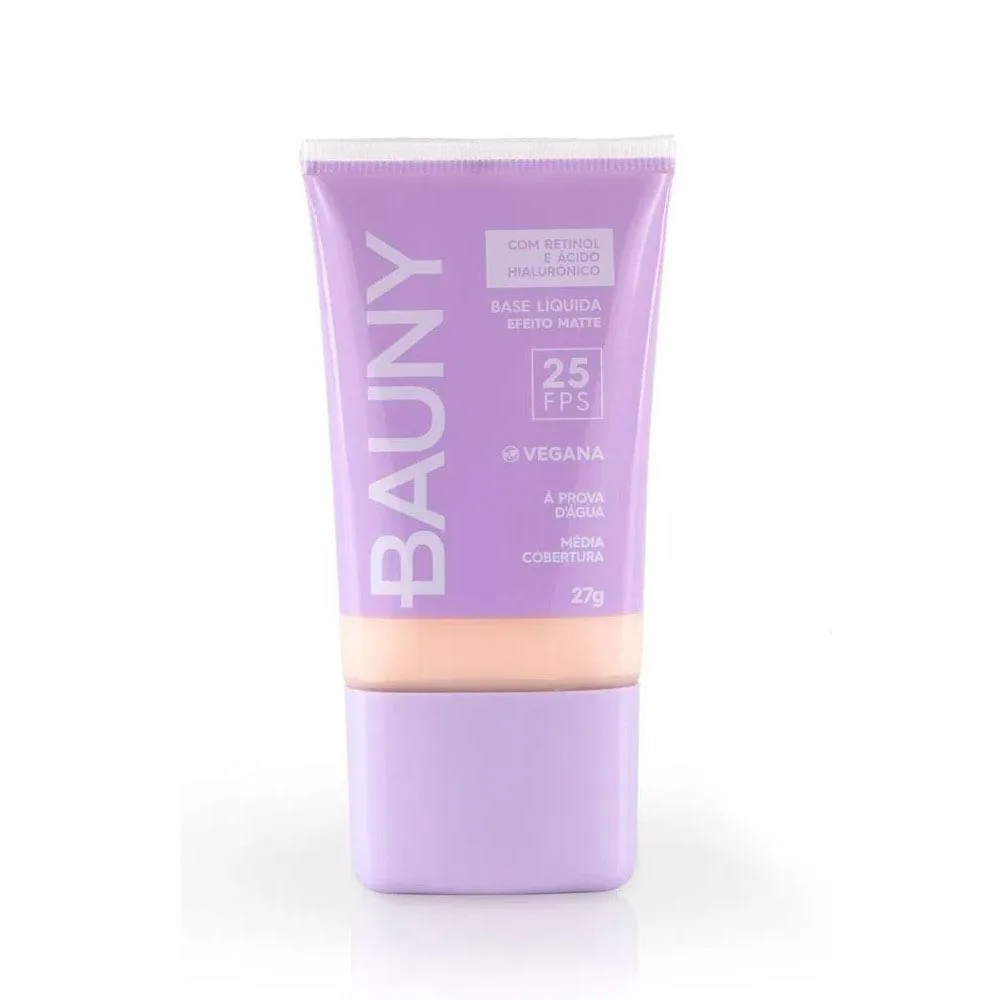 A base líquida com efeito matte da Bauny possui média cobertura, FPS 25 contra raios UVA e UVB, ativo antipoluição digital e urbana e resistência à prova d’ água. Uniformiza a pele e possui em sua formulação ativos como ácido hialurônico, um potente repositor de água na pele e retinol, um derivado da vitamina a conhecido pelo combate ao envelhecimento, que atua promovendo a renovação celular da pele, reduzindo linhas e rugas, além de turbinar a luminosidade, aumentar a firmeza e diminuir os poros. Produto vegano.