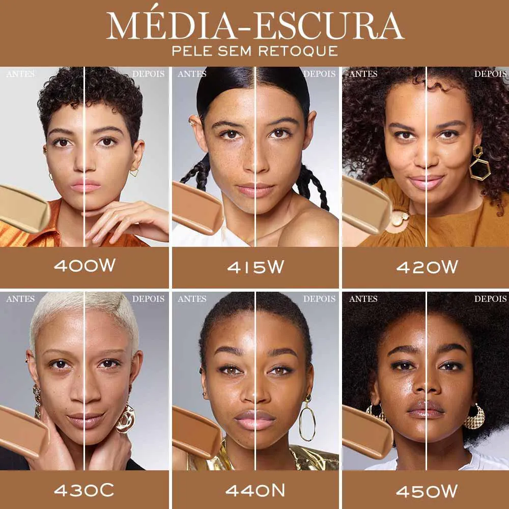 Cobre perfeitamente as imperfeições com cobertura total e ajustável, com acabamento matte natural.