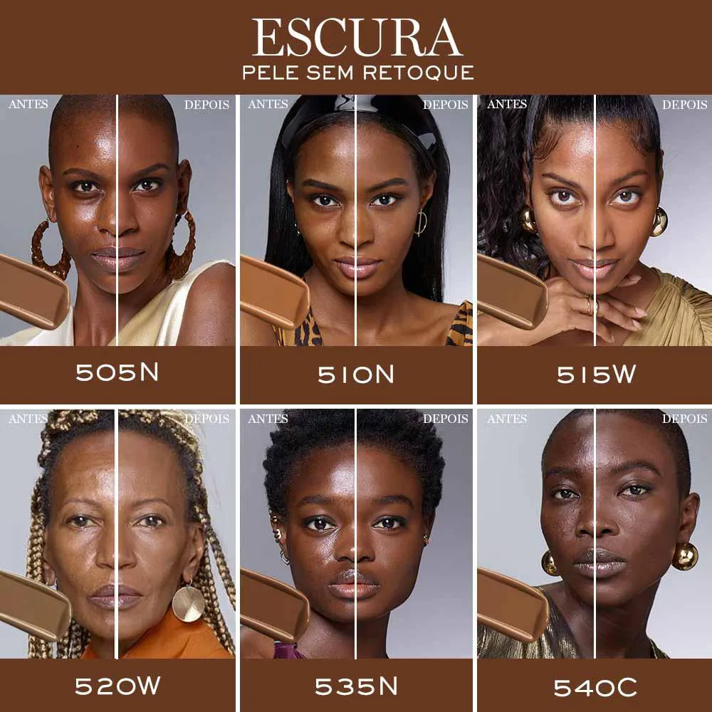 Cobre perfeitamente as imperfeições com cobertura total e ajustável, com acabamento matte natural.