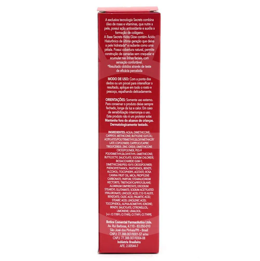 A Base Secrets Hidra Glow contém Ácido Hialurônico de última geração que deixa a pele hidratada* e radiante como uma pétala.