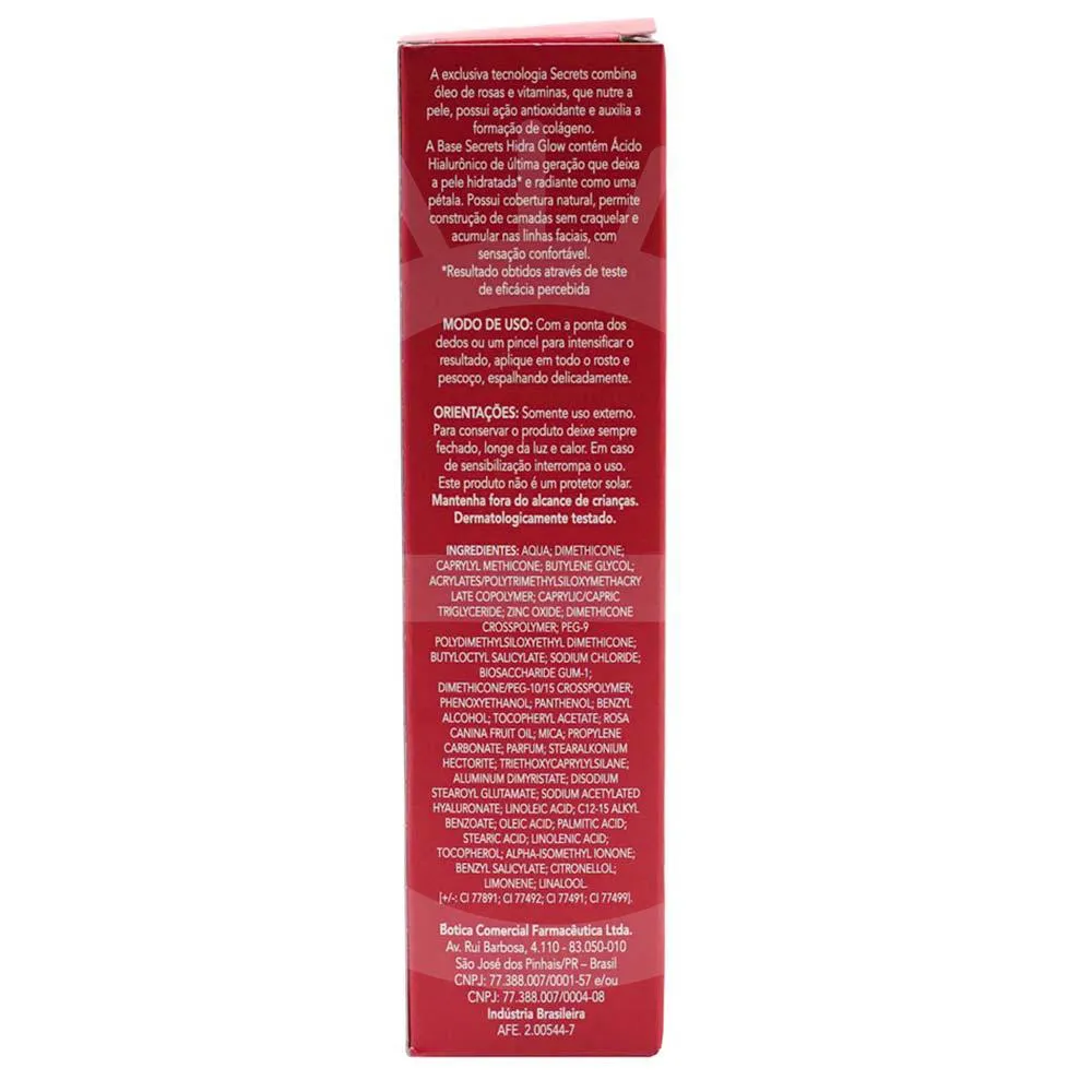 A Base Secrets Hidra Glow contém Ácido Hialurônico de última geração que deixa a pele hidratada* e radiante como uma pétala.