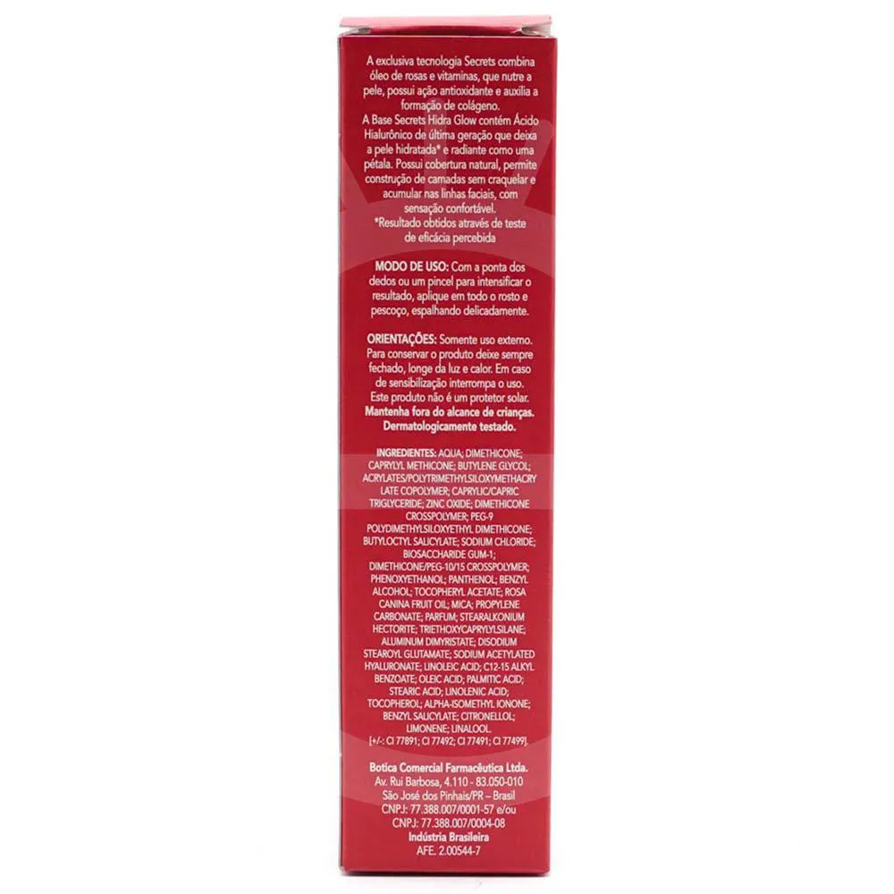 A Base Secrets Hidra Glow contém Ácido Hialurônico de última geração que deixa a pele hidratada* e radiante como uma pétala.