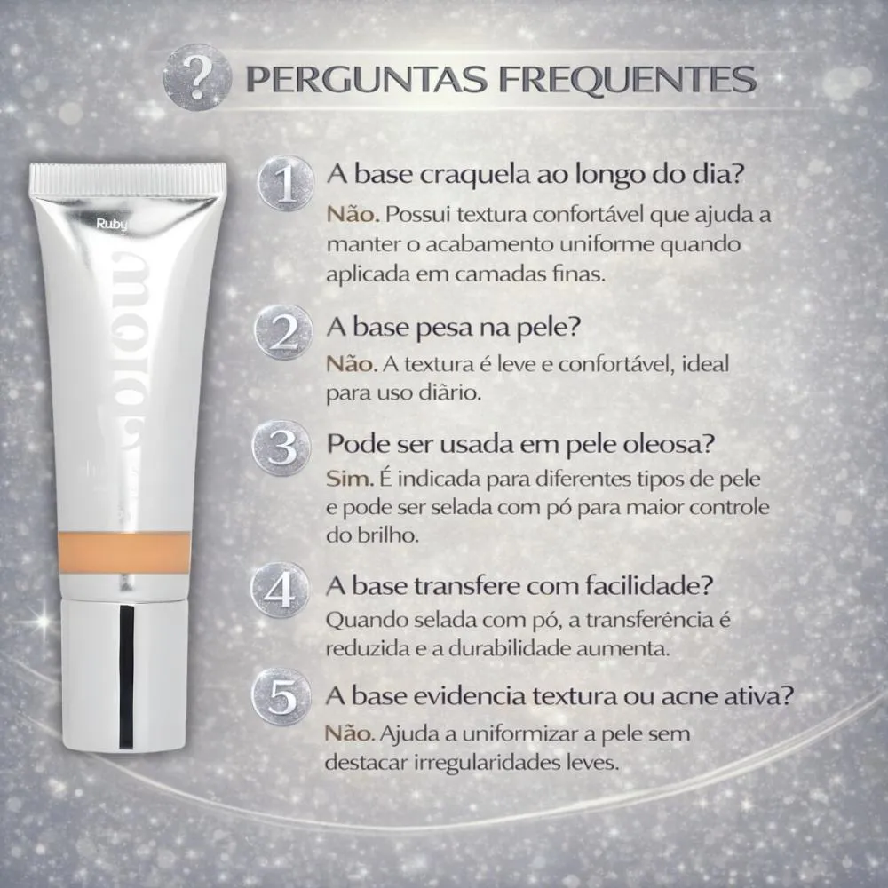 - 1. Prepare a pele com um primer facial para uniformizar a textura e prolongar a duração da maquiagem. - 2. Aplique uma pequena quantidade de base no rosto, utilizando um pincel, esponja ou as pontas dos dedos. - 3. Espalhe uniformemente do centro do rosto para as extremidades, construindo camadas finas até obter a cobertura desejada. - 4. Para um acabamento mais natural, umedeça levemente a esponja antes de aplicar a base. - 5. Finalize com um pó facial para selar a maquiagem e controlar o brilho ao longo do dia.Anvisa: 25351.108606/2025-08