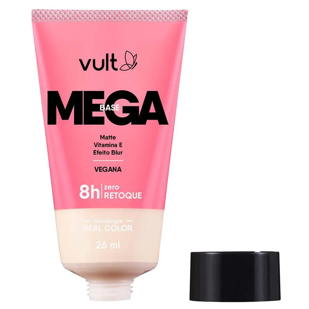 A Mega base é uma base de efeito matte aveludado com acabamento construtível, quanto mais se aplica mais cobertura terá. Com vitamina e, possui 8h de zero retoque, além de ser vegana e cruelty free. Essa base foi desenvolvida pela tecnologia real color: cores reais para mulheres reais - alta pigmentação e cores fiéis da embalagem à sua pele.