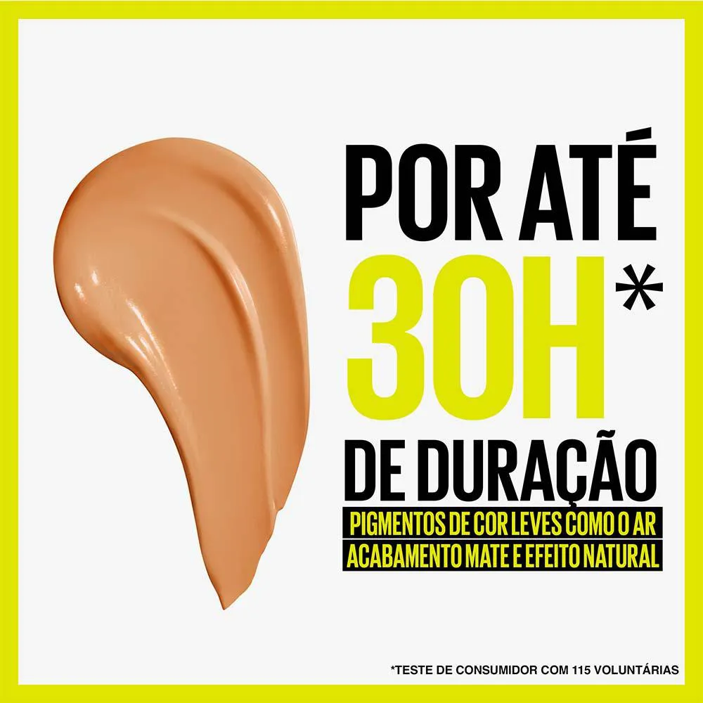 A base de alta cobertura de Maybelline NY, que dura até 30 horas e mantém o tom natural da pele, também é indicada para todos os tipos de pele e te permite transformar completamente o visual. Possui 16 tons disponíveis, escolha que mais combina com o seu tom e caso tenha dúvidas, pode encontrar a base perfeita através do testador virtual no site de Maybelline NY Brasil.Benefícios: