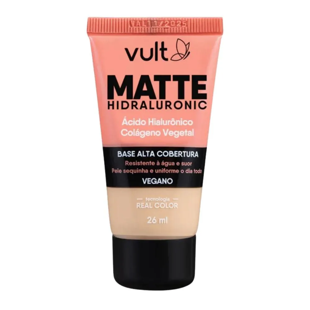 A Base Matte que você já conhece e ama, com a mesma quantidade de produto e agora ainda melhor! Inovadora, a Base Matte Hidraluronic Vult V200 contém Ácido Hialurônico , conhecido por deixar aquela sensação de pele hidratada, e colágeno Vegetal garantindo alta cobertura e efeito matte confortável que não resseca a pele . Essa Base Vult matte uniformiza o tom de pele sem marcar poros e linhas de expressão, além de controlar o excesso de oleosidade e o brilho ao longo do dia.