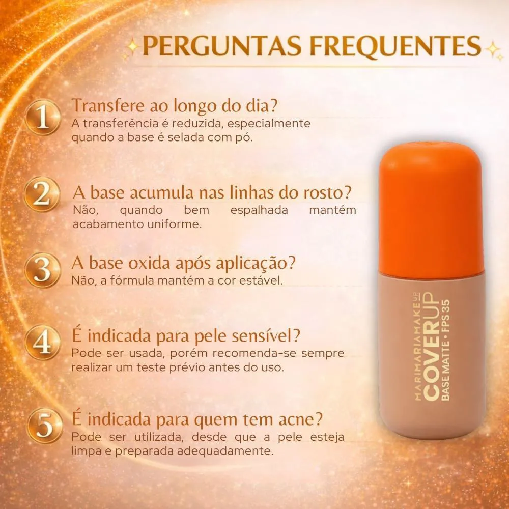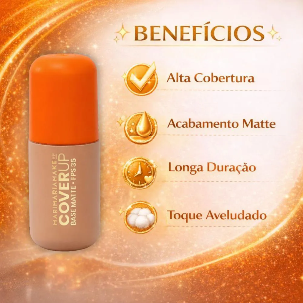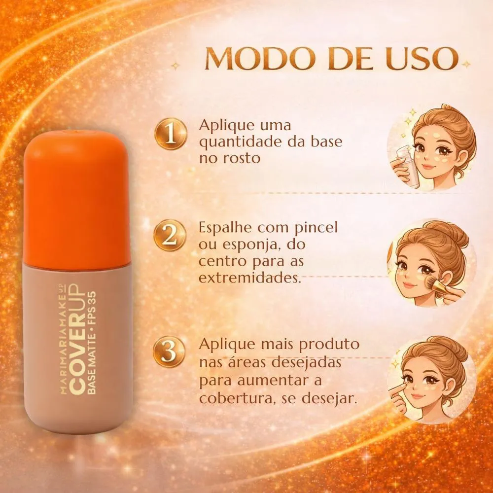 A Base Matte Mari Maria Makeup Cover Up Fps 35 é a escolha ideal para o dia a dia, eventos especiais, ou sempre que você desejar uma pele com acabamento impecável e protegida. Perfeita para maquiagens de trabalho, festas, encontros, fotos e vídeos, garantindo um visual impecável em qualquer situação.Modo de Uso/Aplicação