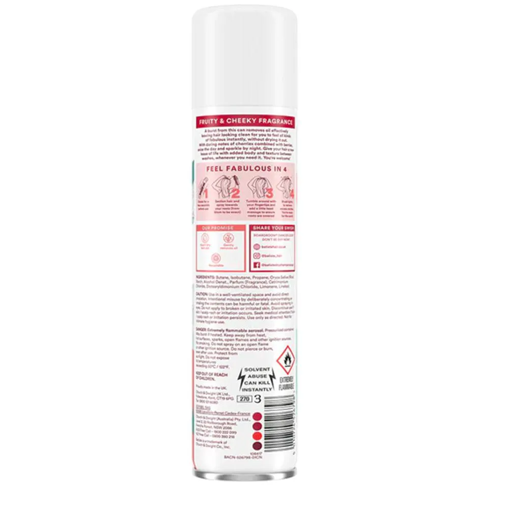 O Batiste Cherry Hair Dry Shampoo é a solução perfeita para cabelos renovados, cheios de volume e com um perfume irresistível de cereja. Ideal para um dia corrido ou para dar um toque final no seu penteado!
