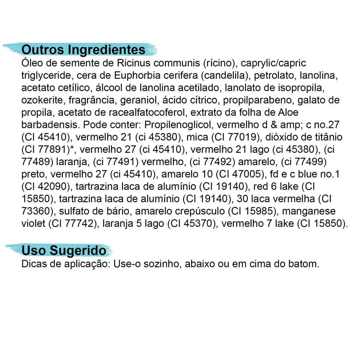 Óleo de rícino, Aloe barbadensis, Vitamina E, ceras e pigmentos cosméticos autorizados. (Lista completa disponível na embalagem.)