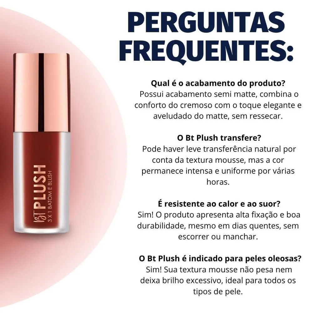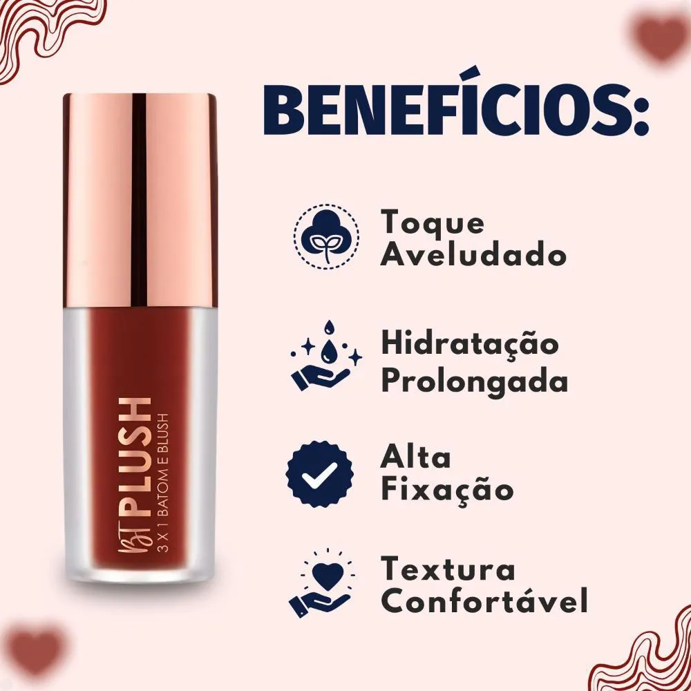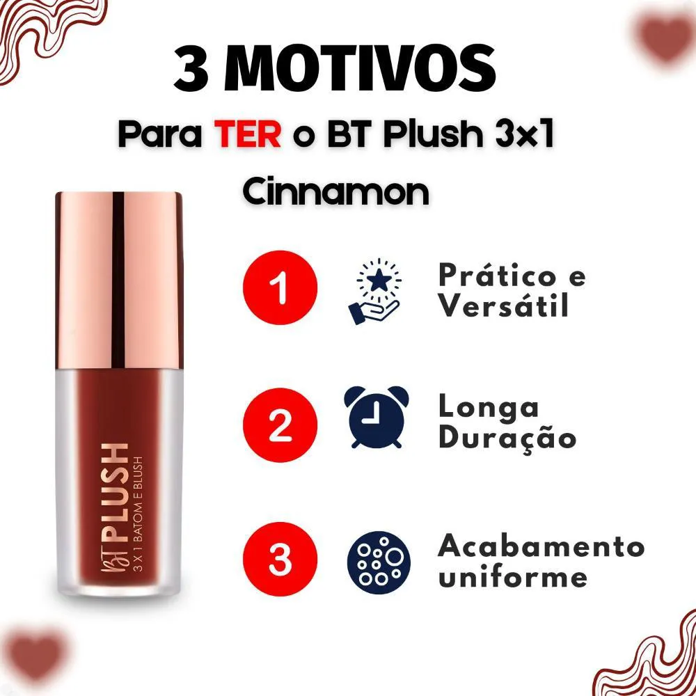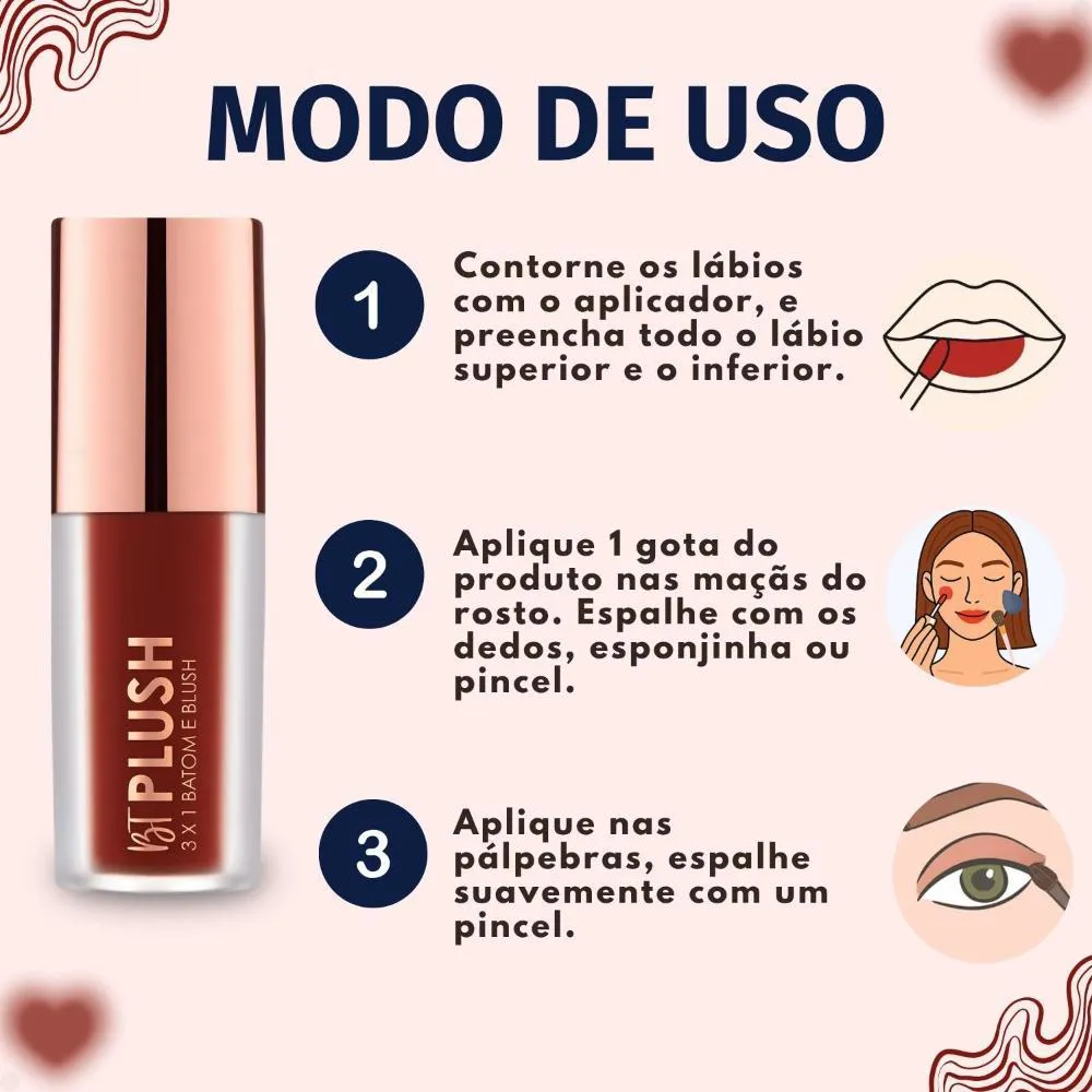 O Bt Plush 3x1 Cinnamon é ideal para o dia a dia, proporcionando uma maquiagem rápida e elegante para o trabalho, estudos ou compromissos casuais. Perfeito para viagens, pois reduz a quantidade de produtos na necessaire, otimizando espaço e peso. Excelente para eventos especiais, como festas e jantares, onde um toque de cor sofisticado faz toda a diferença. Sua multifuncionalidade o torna um item indispensável para retoques rápidos em qualquer momento, garantindo que você esteja sempre impecável.Modo de Uso/Aplicação: