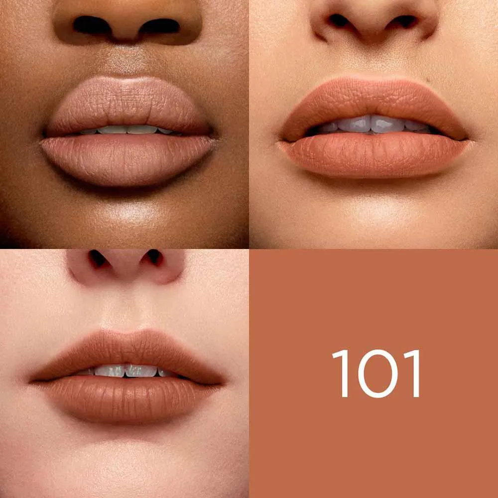Ele transforma a textura cremosa em um véu aveludado ao tocar os lábios, oferecendo um acabamento suave e difuso que disfarça imperfeições enquanto mantém o visual elegante.