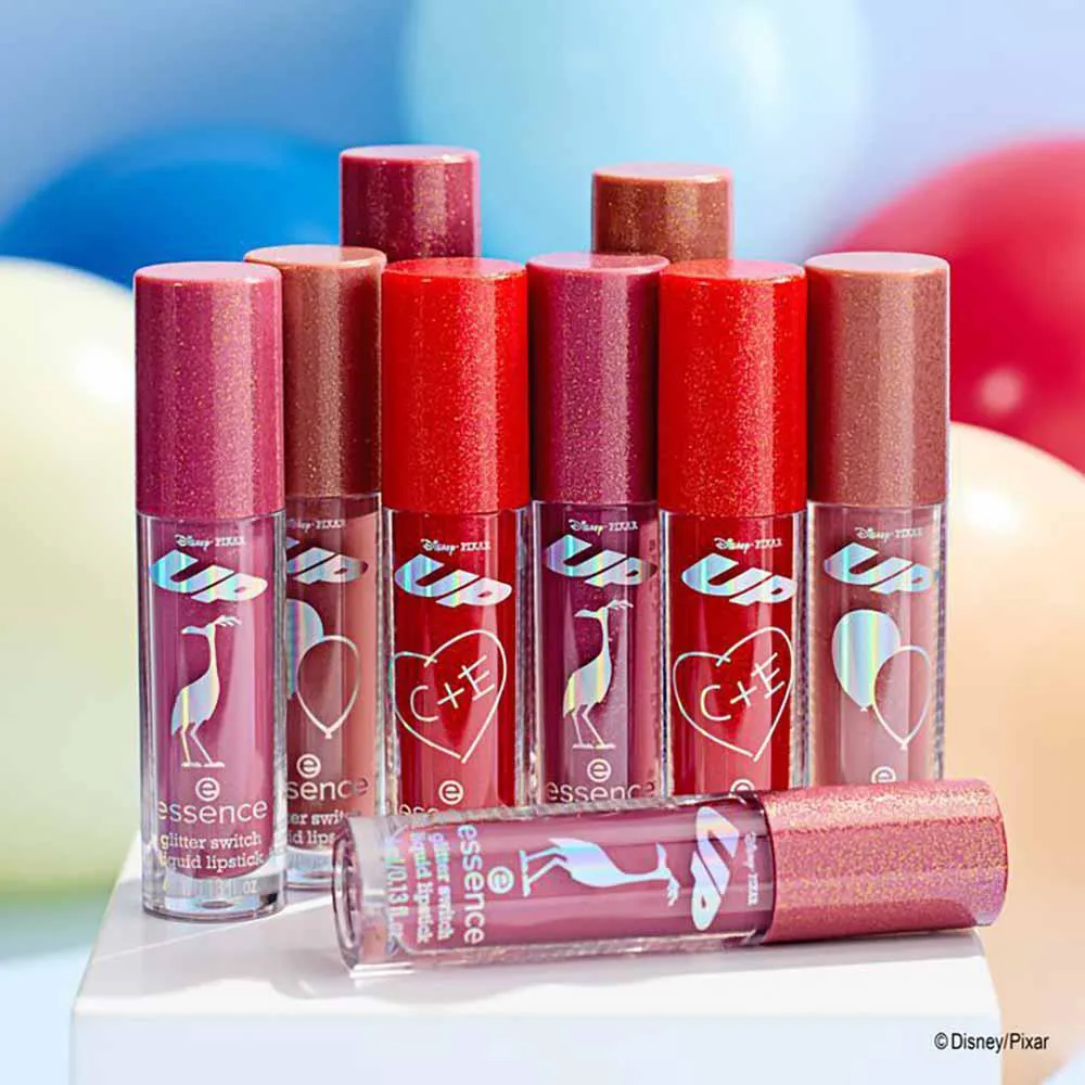 O Batom líquido Edição Limitada Essence Disney Pixar Up entrega cor intensa com um toque de glitter.