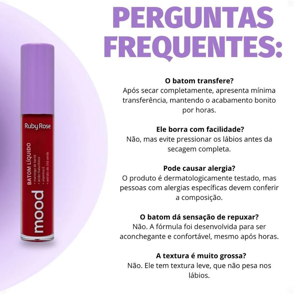 Dê vida aos seus lábios com o Batom Líquido Ruby Rose Mood, a arma secreta para um visual impactante e cheio de personalidade. Imagine seus lábios adornados com uma cor intensa e um acabamento impecável que dura o dia todo. Este batom não apenas realça sua beleza, mas também cuida dos seus lábios, proporcionando uma sensação de conforto e hidratação. Ideal para mulheres que desejam expressar sua individualidade e confiança em cada sorriso. Prepare-se para elevar sua maquiagem a um novo patamar com este batom que une beleza, cuidado e durabilidade em um único produto. Experimente a sensação de lábios irresistíveis e um visual que atrai olhares por onde você passar.Benefícios Principais