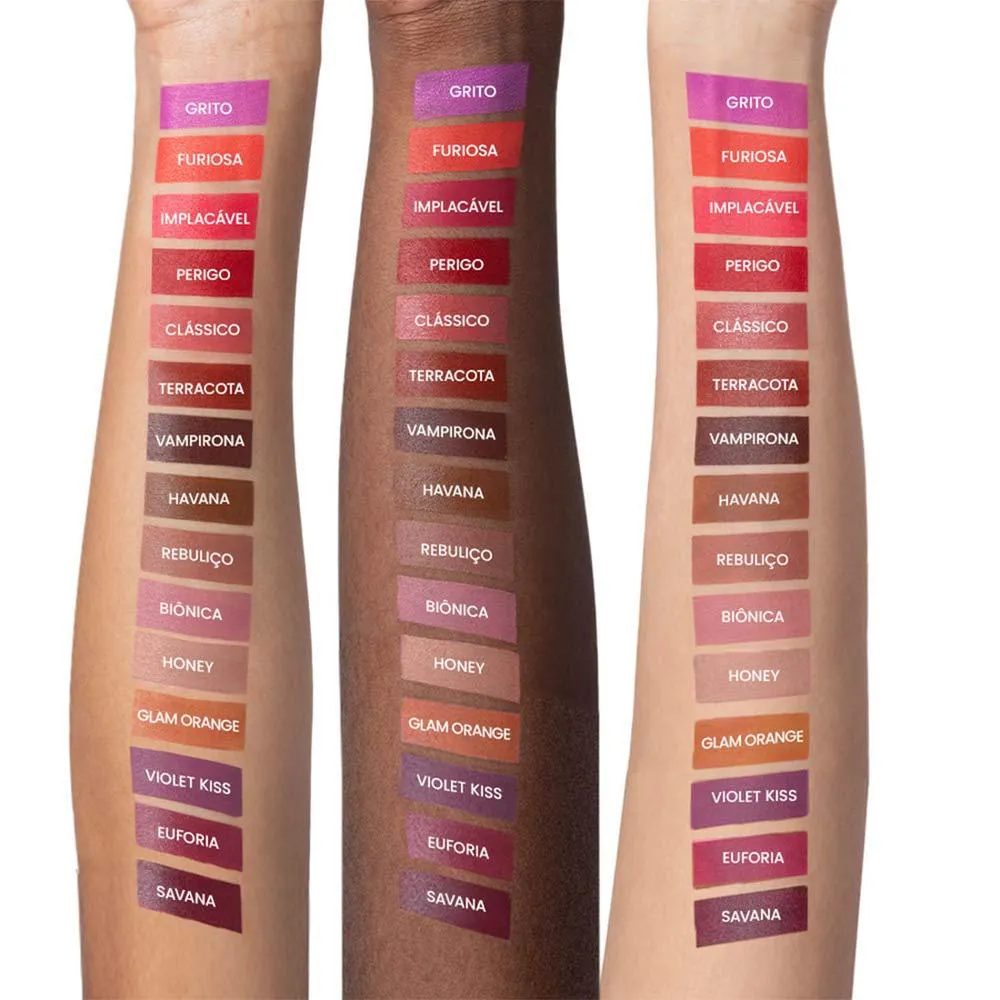 - Acabamento opaco sem ressecar os lábios.